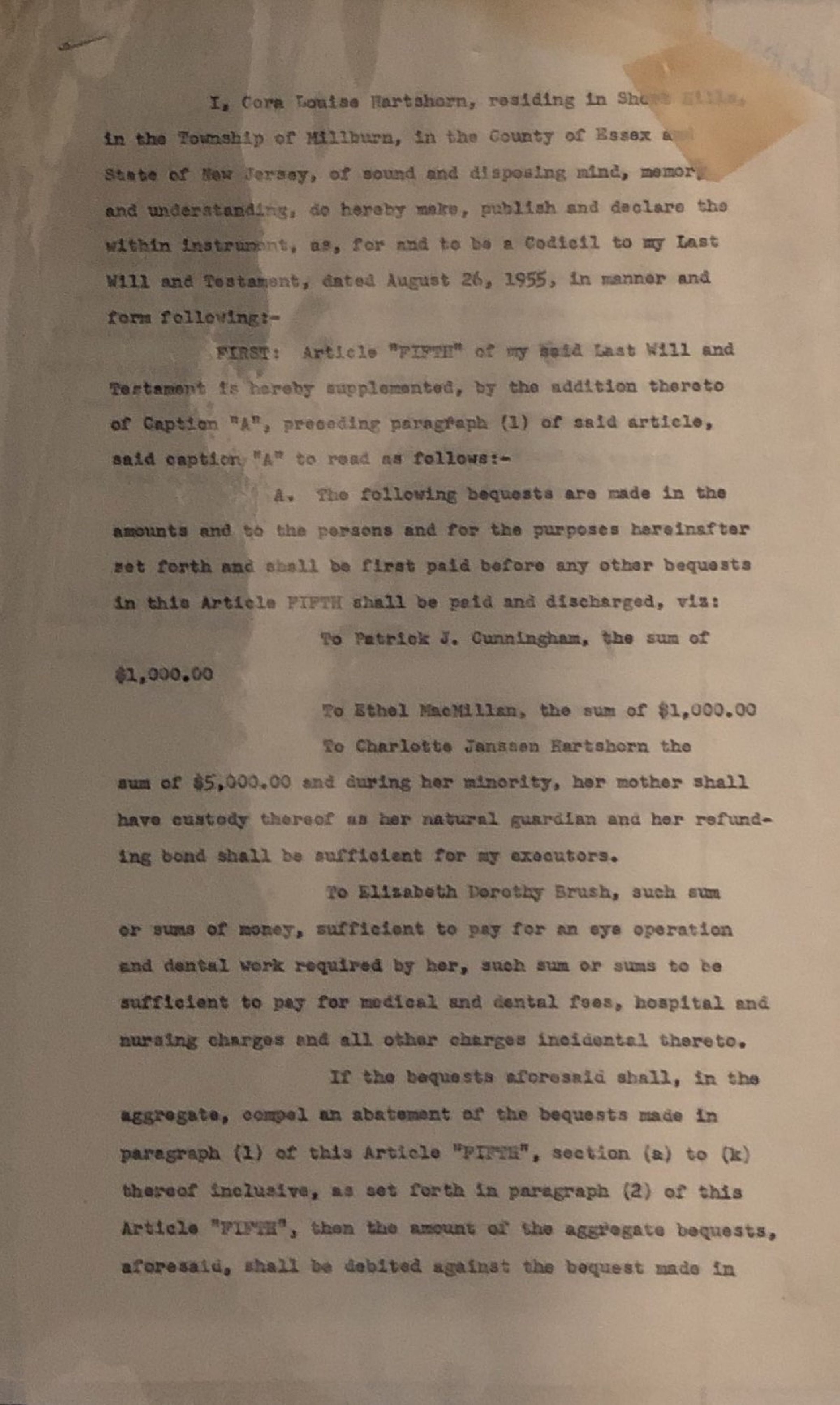 Hartshorn: Cora Hartshorn's Will, Unsigned Typed Copy