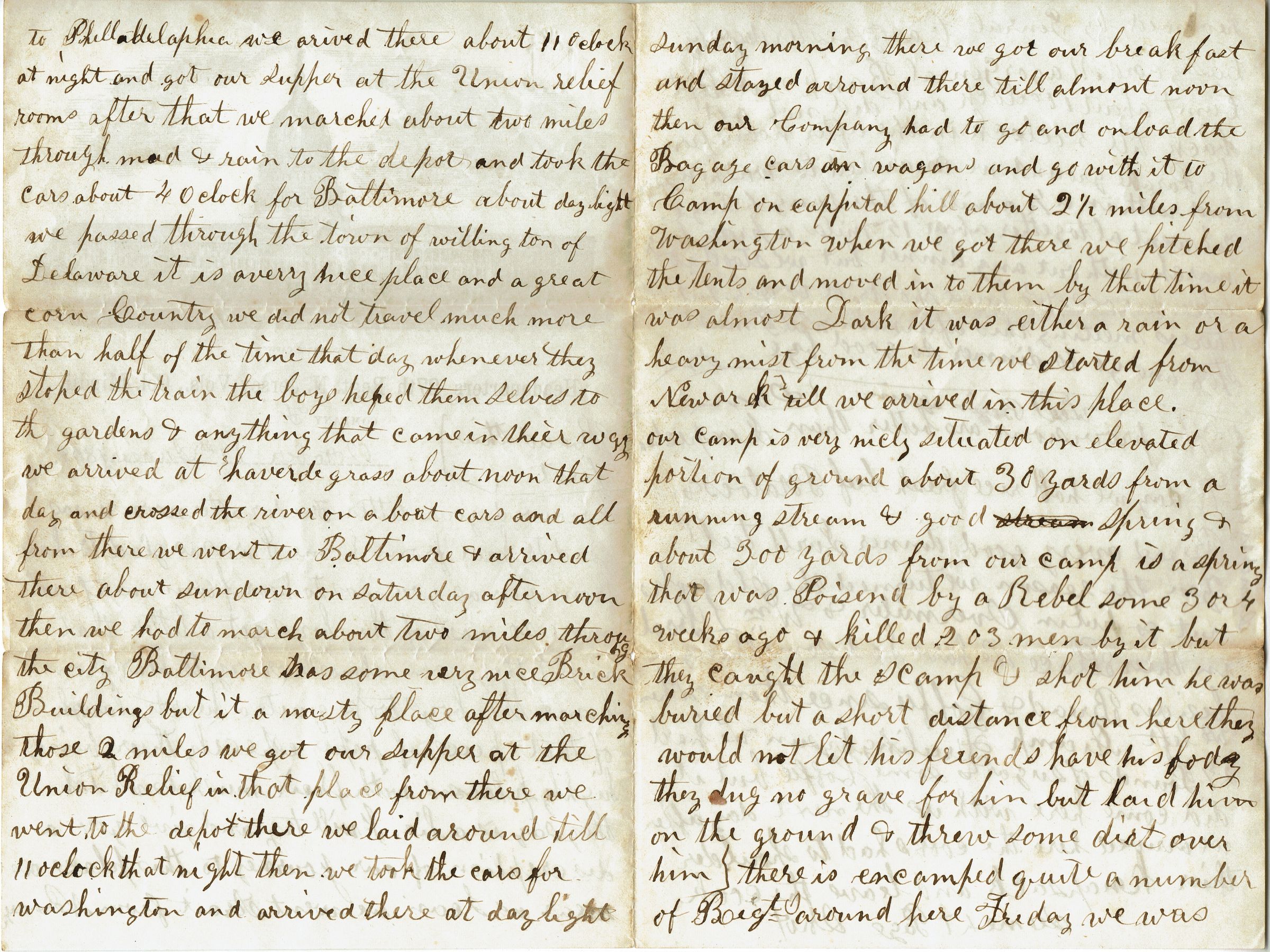 Letter from Samuel B. Parsil to his family dated October 19, 1862 written on 27th NJ Infantry stationery and describing the trip from Newark, NJ through Philadelphia and Baltimore, to the camp not far from Washington, D.C. Mentions that their camp was near a spring that was poisoned by the Rebels, 2-3 weeks prior, resulting in the deaths of 203 men. The Regiment was reviewed by General Casey and Major General Banks. Mentions the food and discusses sugar supply when they left Camp Frelinghuysen.Acquisition