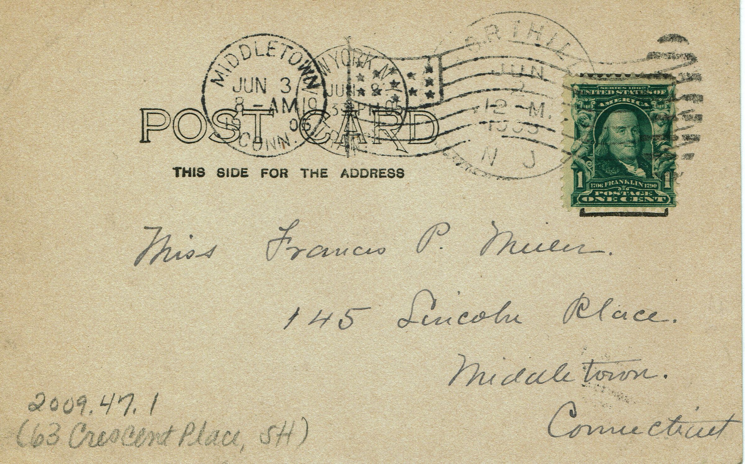 Back of postcard is undivided (indicating age prior to 1907) and was mailed to "Miss Frances P. Miller; 145 Lincoln Place; Middletown, Connecticut." Three cancellation marks and light soiling around address, Light yellowing all over and more pronounced on edges.Acquisition