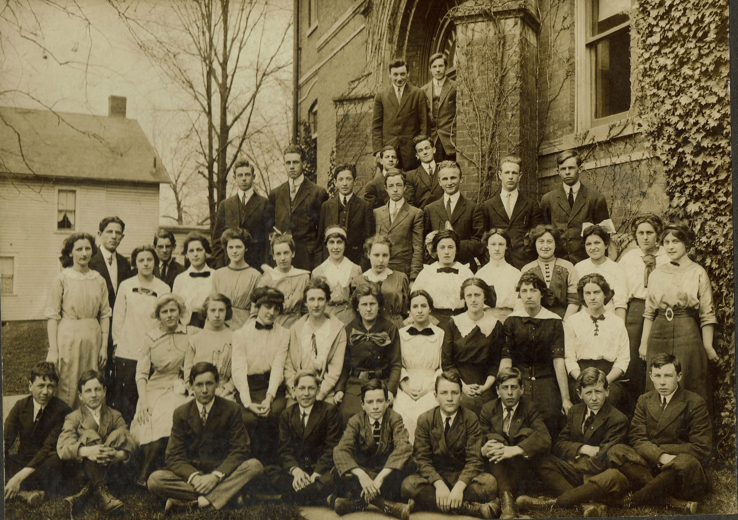 Photograph of the Short Hills High School with notes from John Murray. Notes read: Short Hills High School, Hobart Road. House in Background is Wittkop house that was moved and is at 90 Hobart Avenue today. The following people are identified in the photograph: Clara Pflueger, Anna Pfleuger, Irene Rimback, J. David Hoye, Ralph Bair, Florence Partington, Helen Partington, Joe Rinback (?) John Skelly, Robert Marshall, Dave Brown, Helen Cook.Collection
