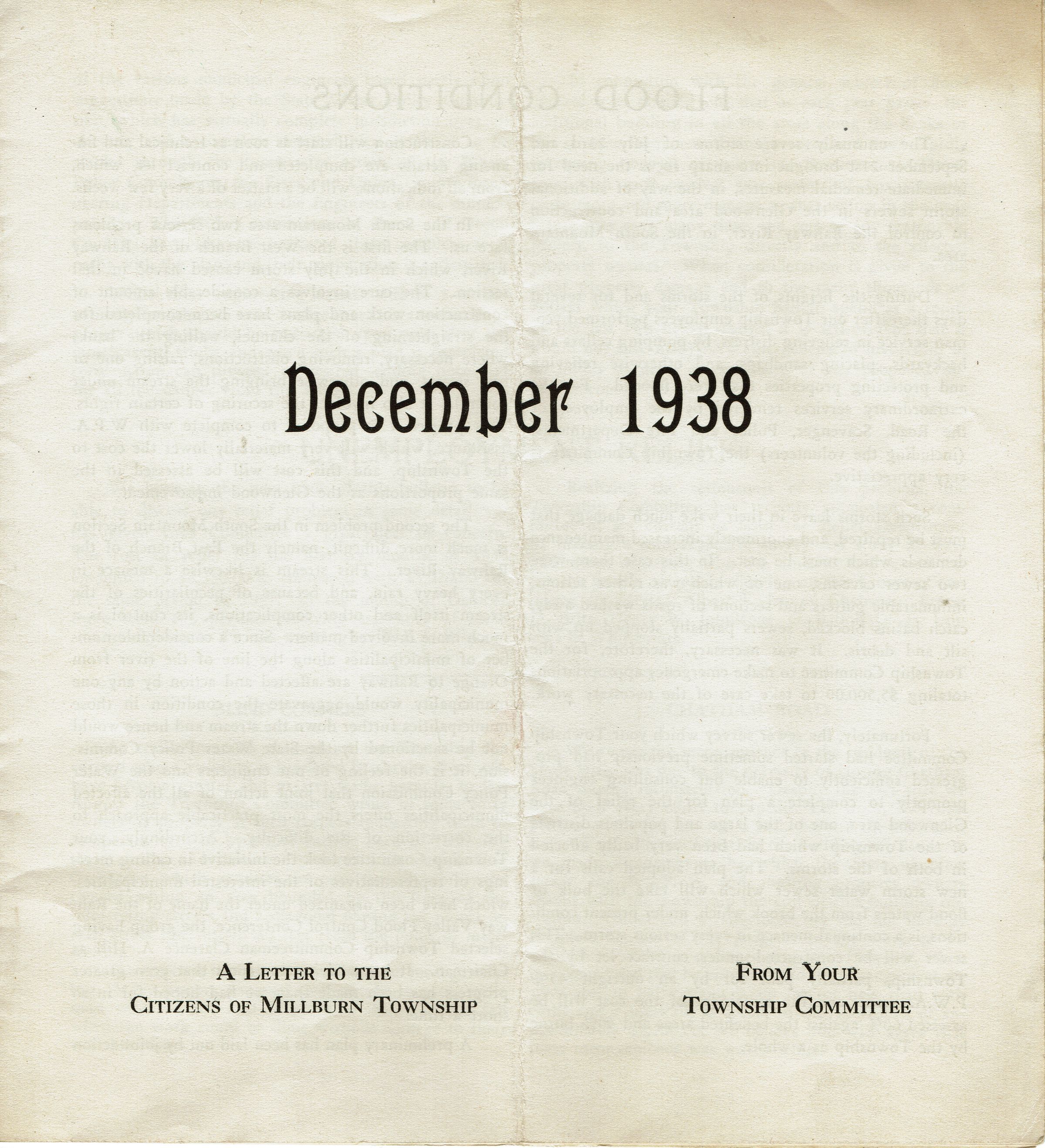 Township Committee Report, December 1, 1938. 8 pages, illustrated with B&W photograph of Albert F. Daly, Supervisor of Public Works. Topics covered include: Flood Conditions, Unemployment relief, Traffic concerns with blind corners and Chatham Road reconstruction, Township Department of Public Work, Zoning for Apartment Houses, Cash Basis Budget. Towship Committee Members: Ira C. Moore, Jr. (Chairman), John A. Stewart III, Clarence A. Hill, A. Ross Meeker, Charles E. Van FleetAcquisition