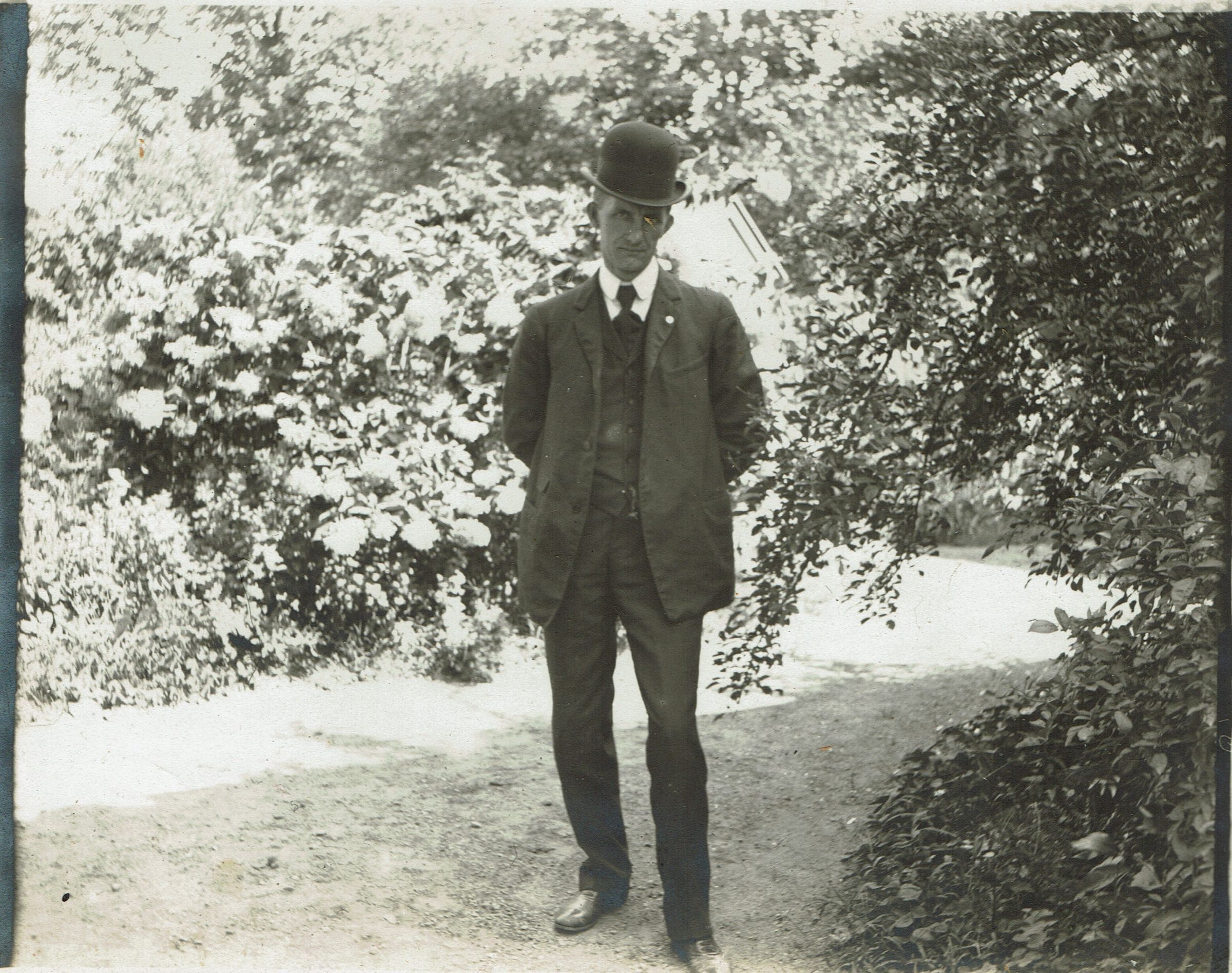 Unidentified man standing in a garden wearing a bowler hat. Marshall-Schmidt album, page 50, bottom image.Collection