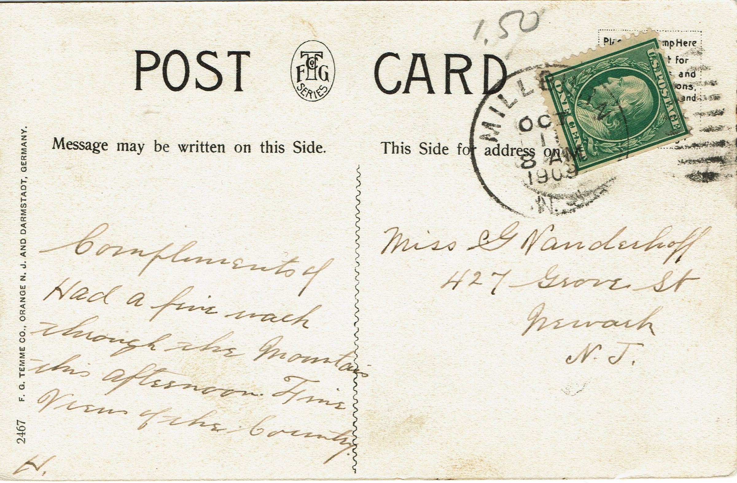 Postally used, postmarked Millburn, October 1, 1909, 8:00 am. Addressed to Mrs. G. Vanderhoff, 427 Grove Street, Newark, NJ.