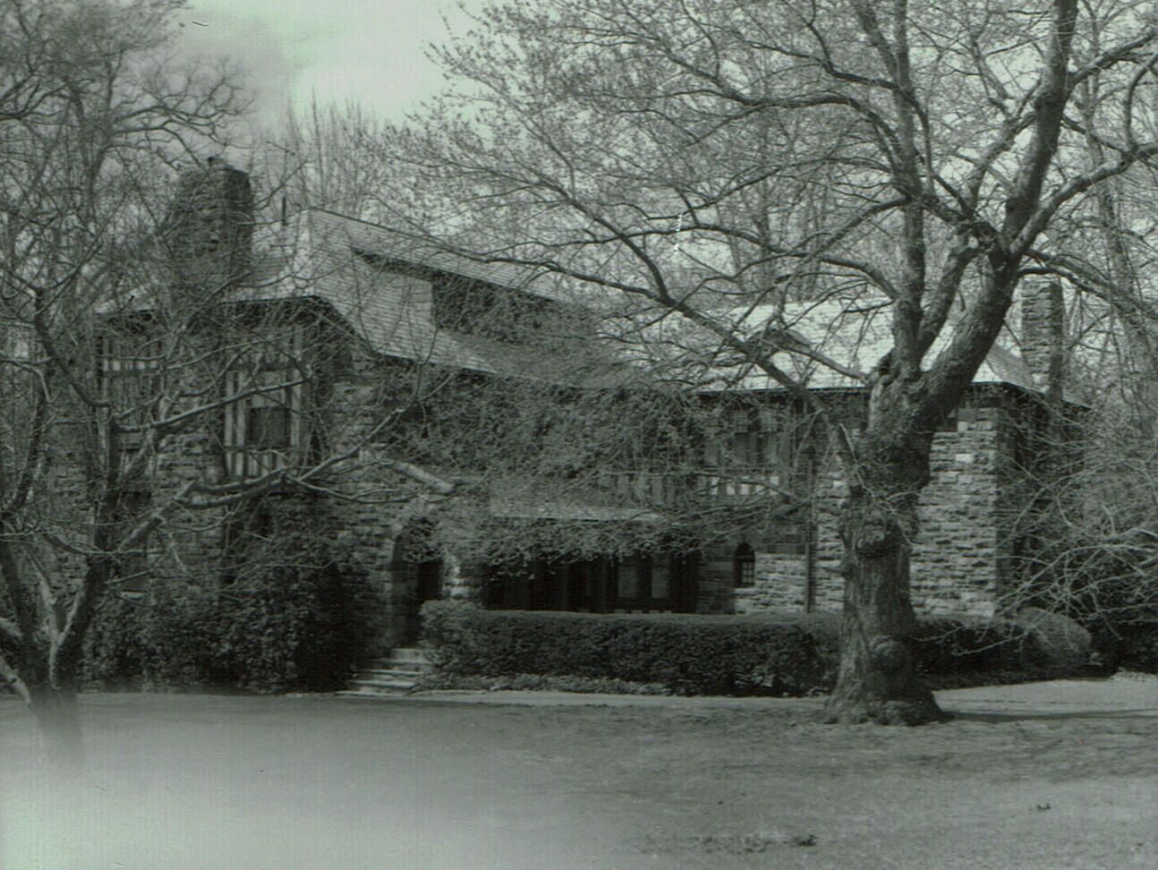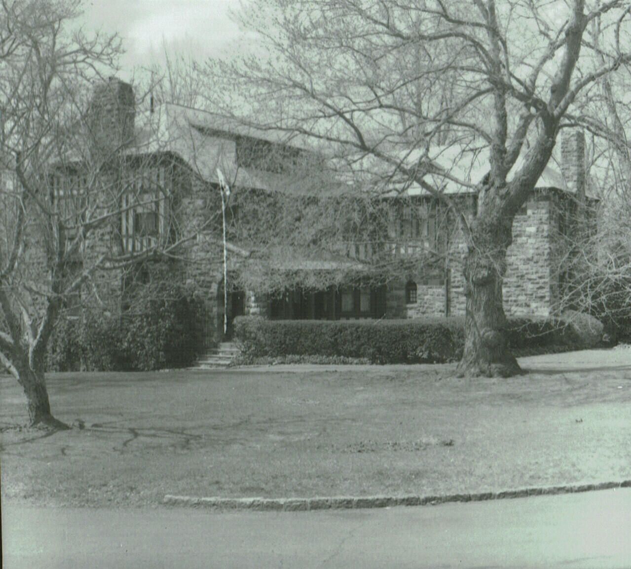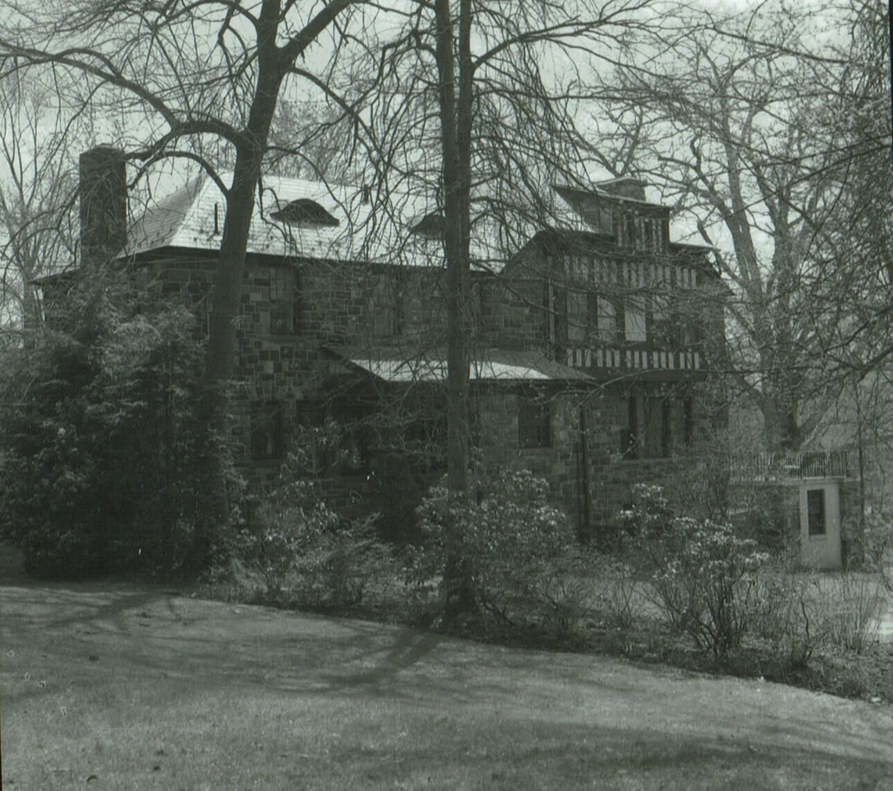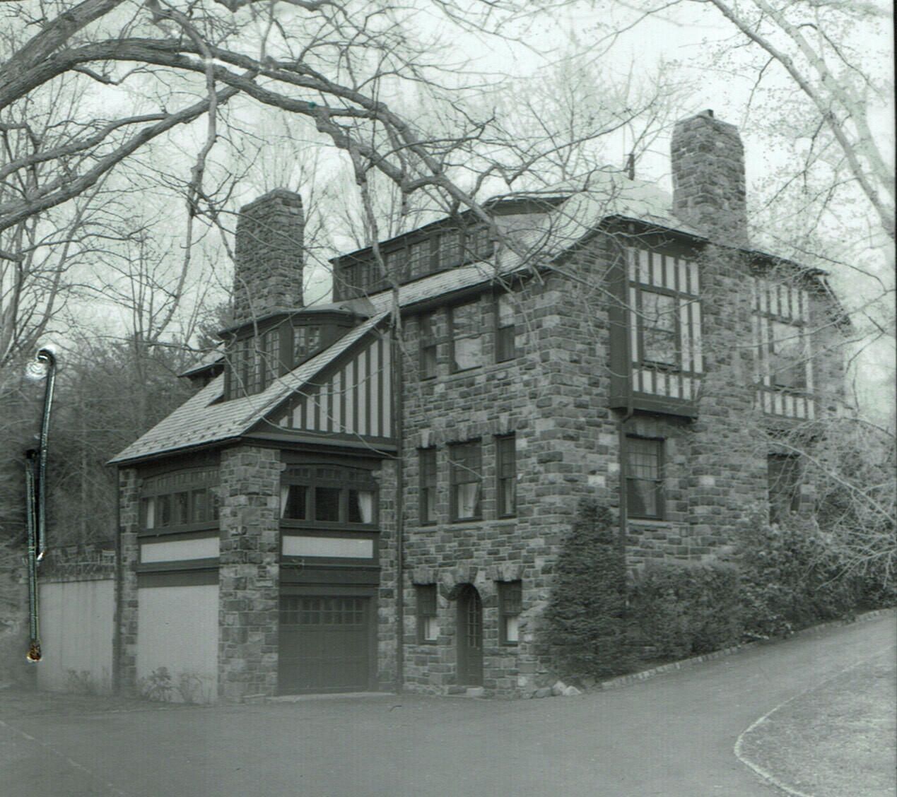 Photograph of 71 Taylor Road. "Stoneacre" - Hartshorn House Number 65. Edward Layng, a local architect and builder for Stewart Hartshorn, built this 20th cent. Eclectic style house in 1908. It has a gable and hip roof with slate covering; exterior finish in stone wood timber and stucco. Note the ornamental chimneys, arched entry-way and bay windows over entrance.Collection