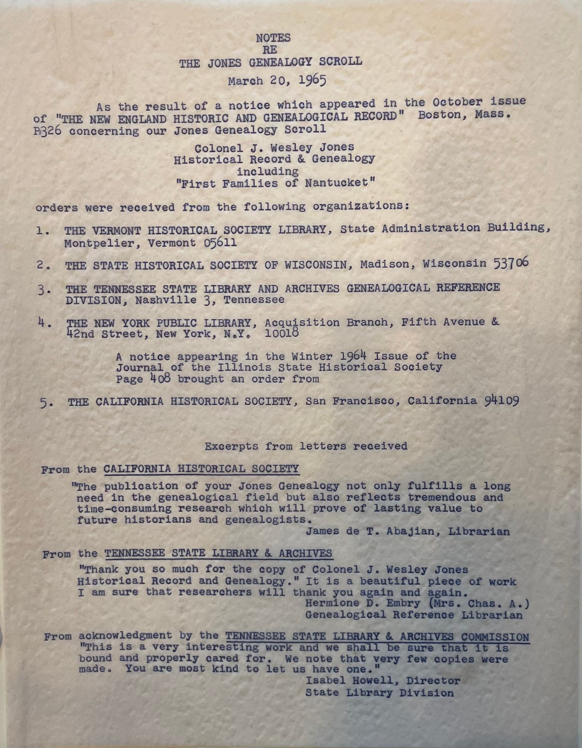 This two page document includes information concerning the Jones Genealogy Record, excerpts from the letters received, and information about the scrolls. Stella Worth Jones Voorhees of 26 Woodcrest Avenue, Short Hills, NJ compiled the information in the scroll.Acquisition