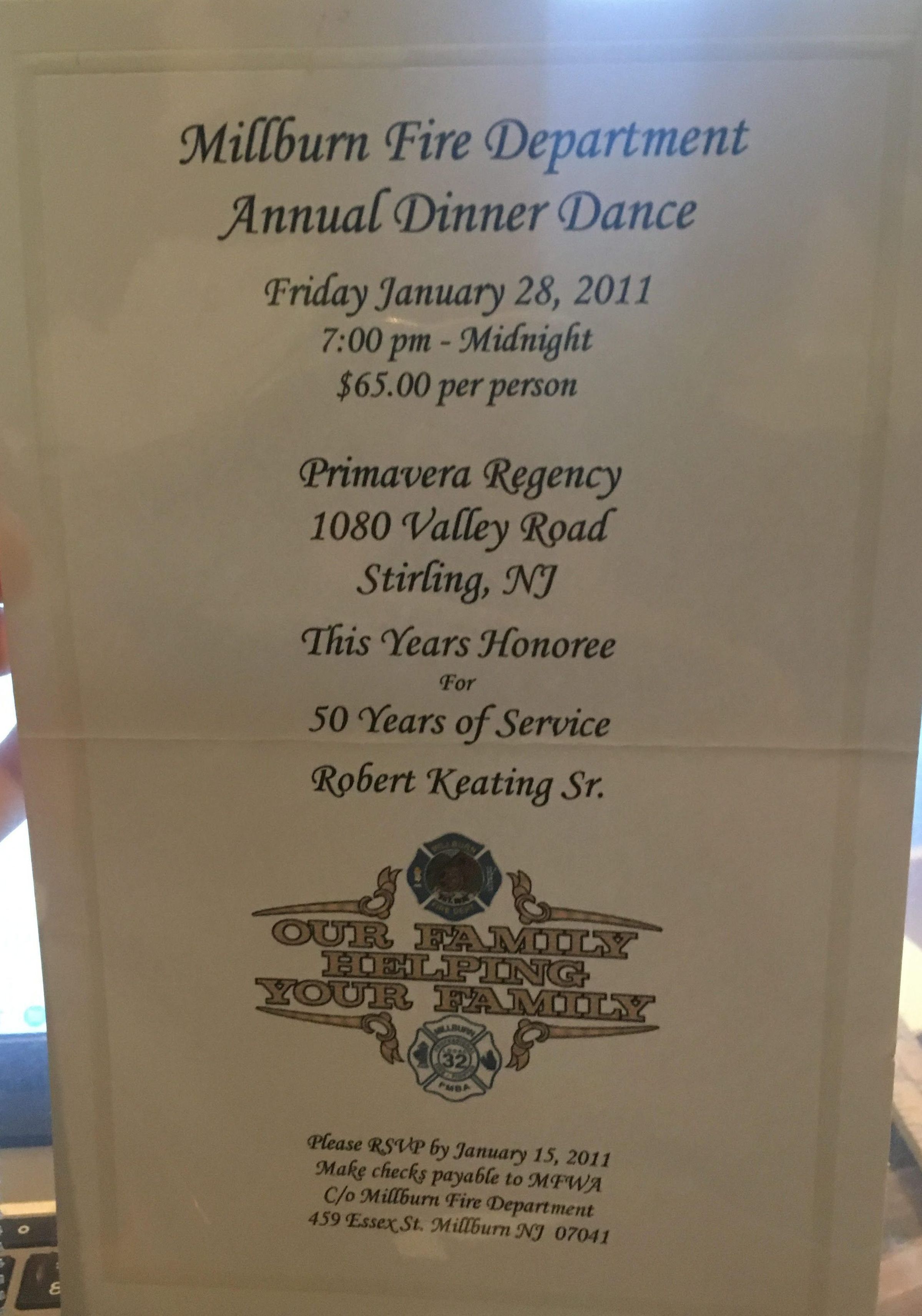 Millburn Fire Department annual dinner dance on January 28, 2011. Honors Robert Keating Sr. for 50 years of service.Dimensions