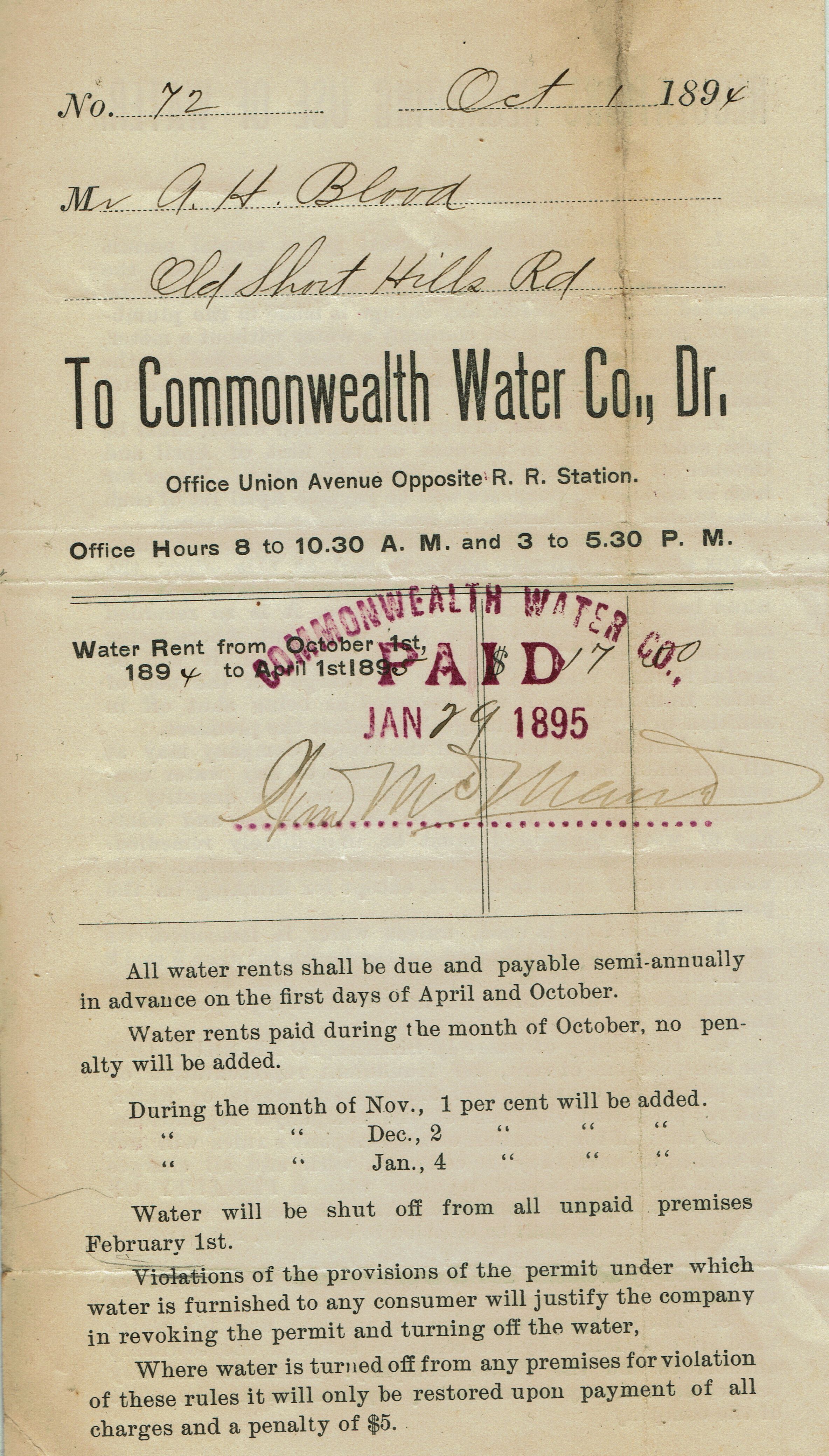 Receipts from the Commonwealth Water Company, Union Avenue to Mr. H. Blood, Old Short Hills Road, dated October 1, 1894 & April 1, 1895.Collection