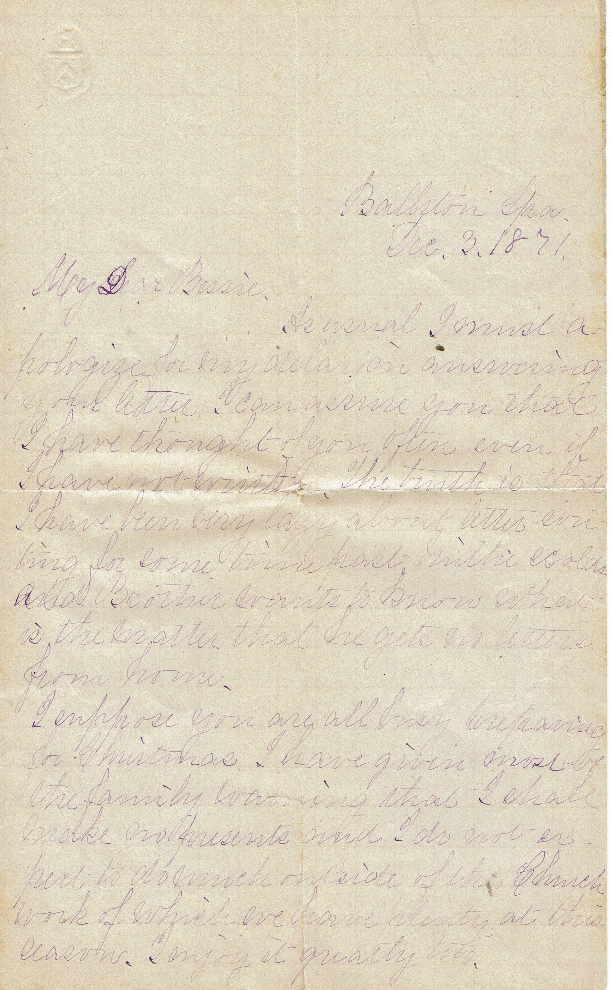 Kellogg: Letter to Bessie Kellogg dated Ballston Spa, December 3, 1871Entry/Object ID