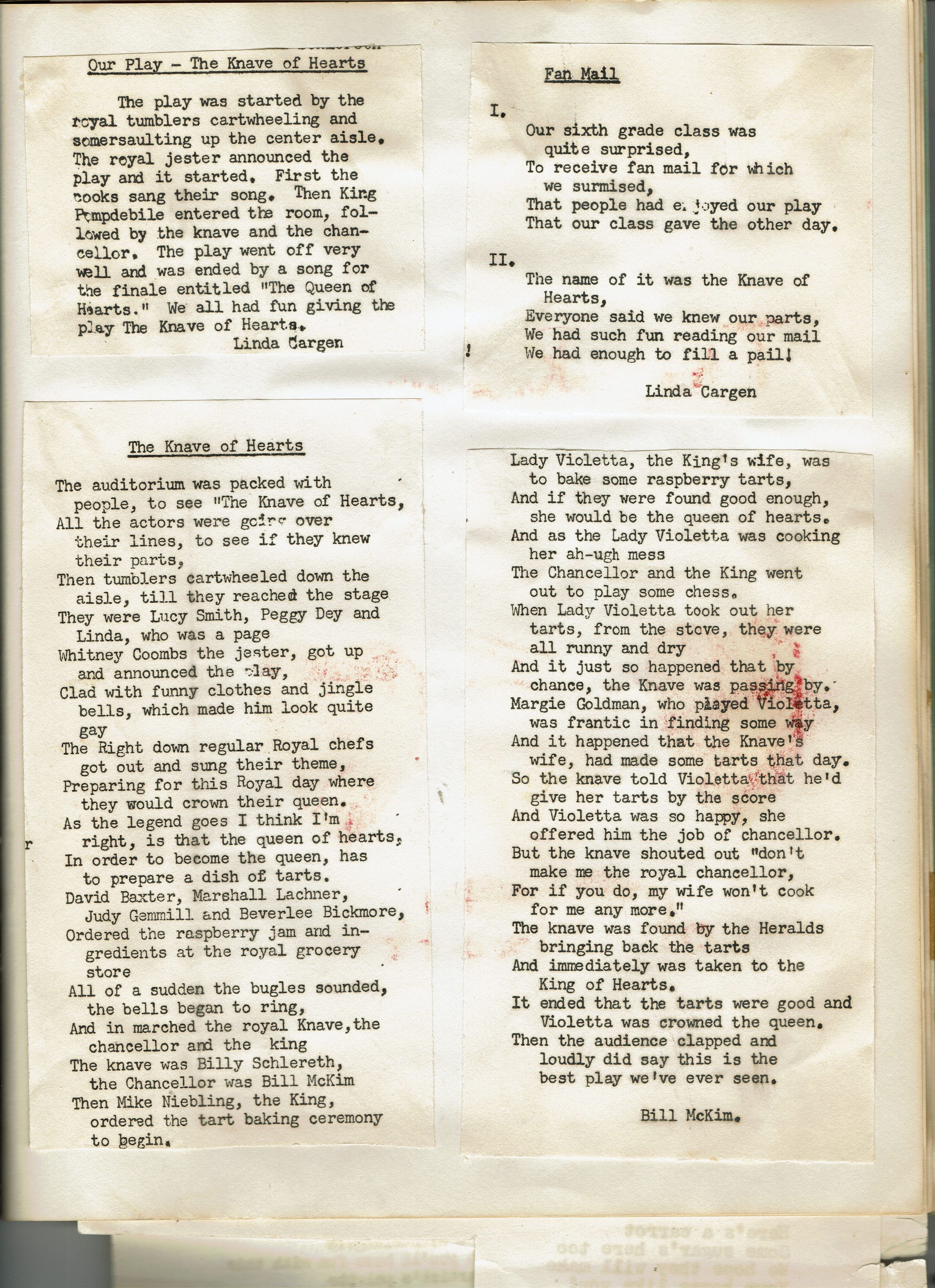 Glenwood School Scrapbook from William McKim, 1952. Contains graduation program, poems commemorating different events throughout the year, B&W photographs, program for the school performance of The Knave of Hearts, signatures from students.Acquisition