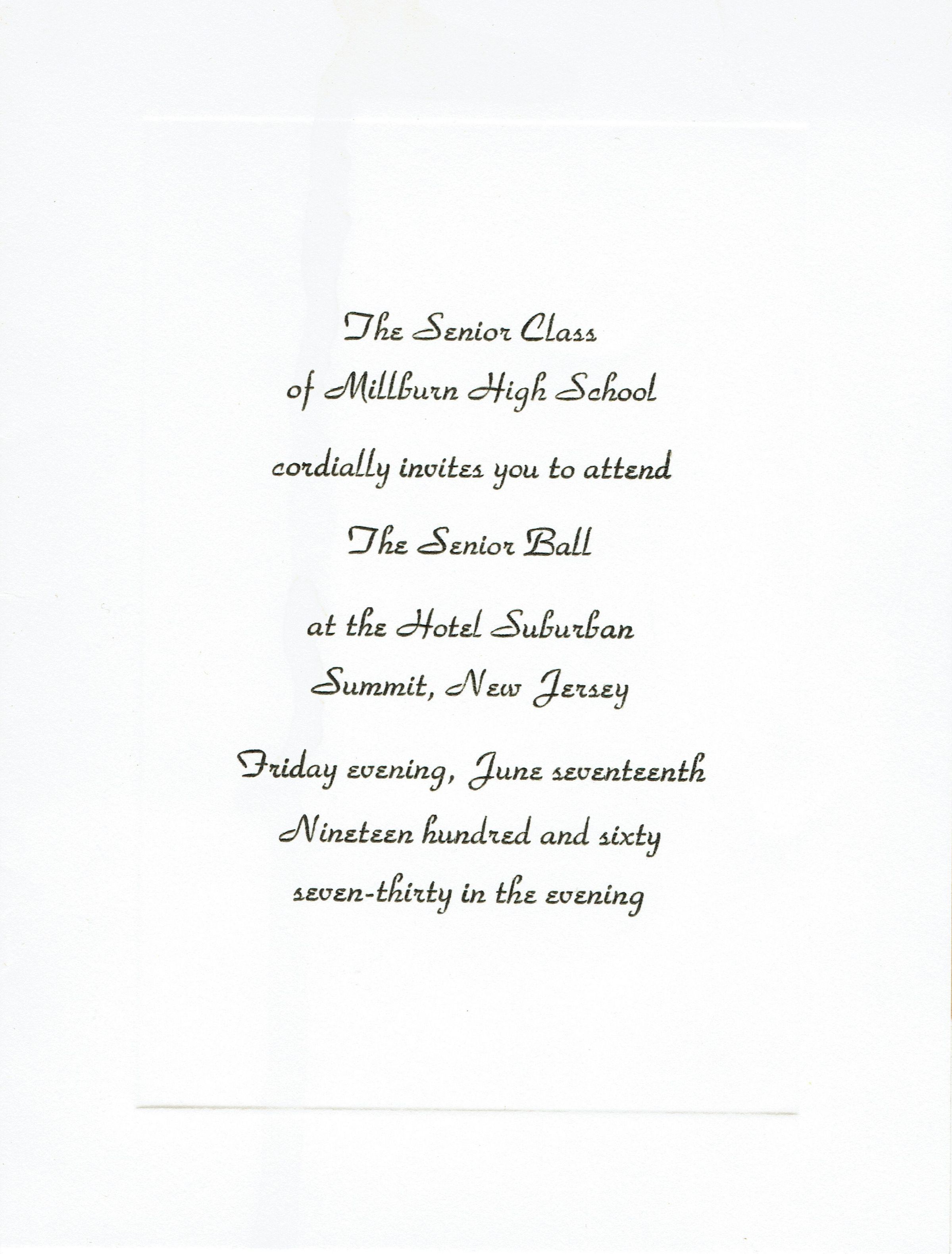 Invitation to the Millburn High School Senior Ball held at the Hotel Suburban, Summit, New Jersey on Friday, June 17, 1960 at 7:30 pm.