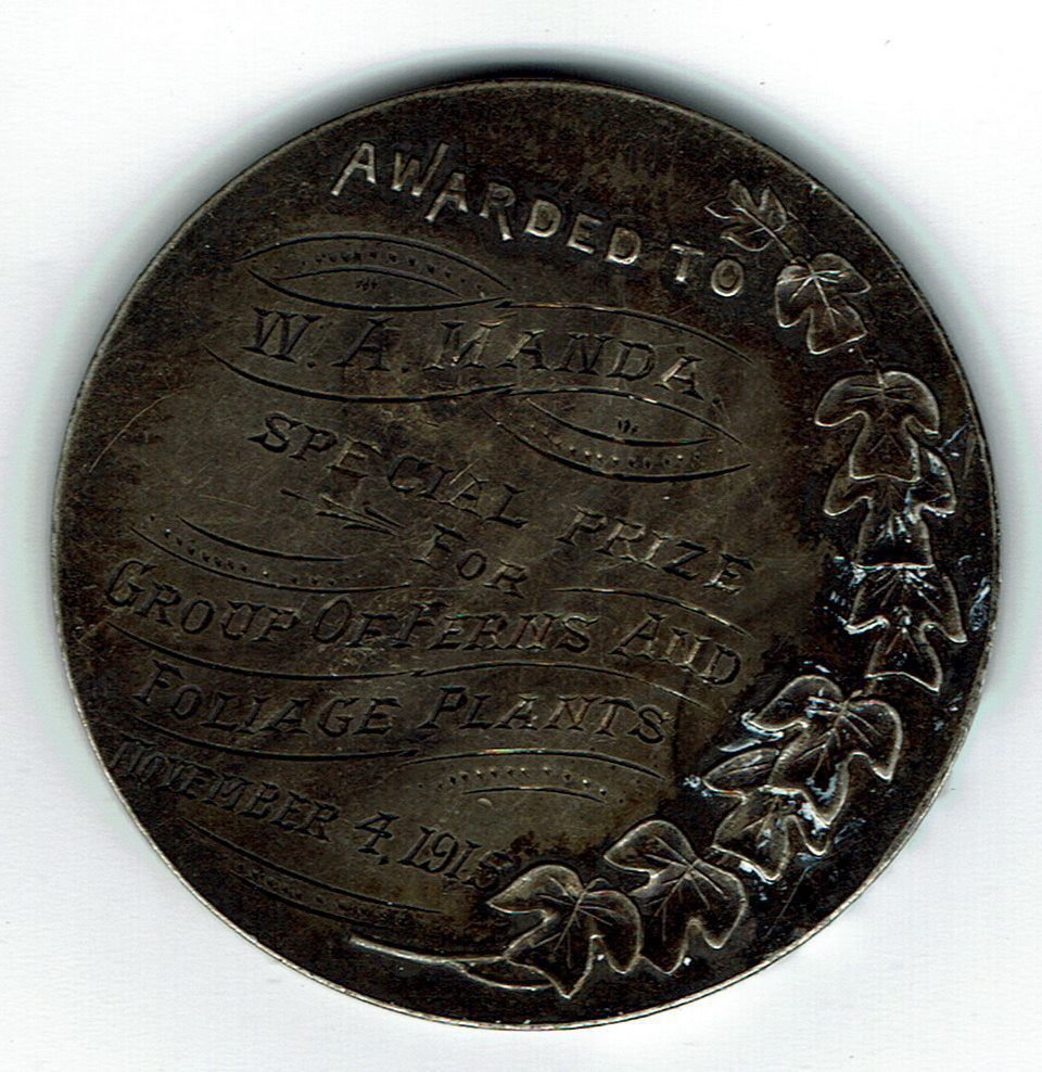 Special prize medal awarded to W. A. Manda of Pitcher & Manda from the Horticultural Society of New York for a group of Ferns and Foliage Plants, November 4, 1915.Acquisition