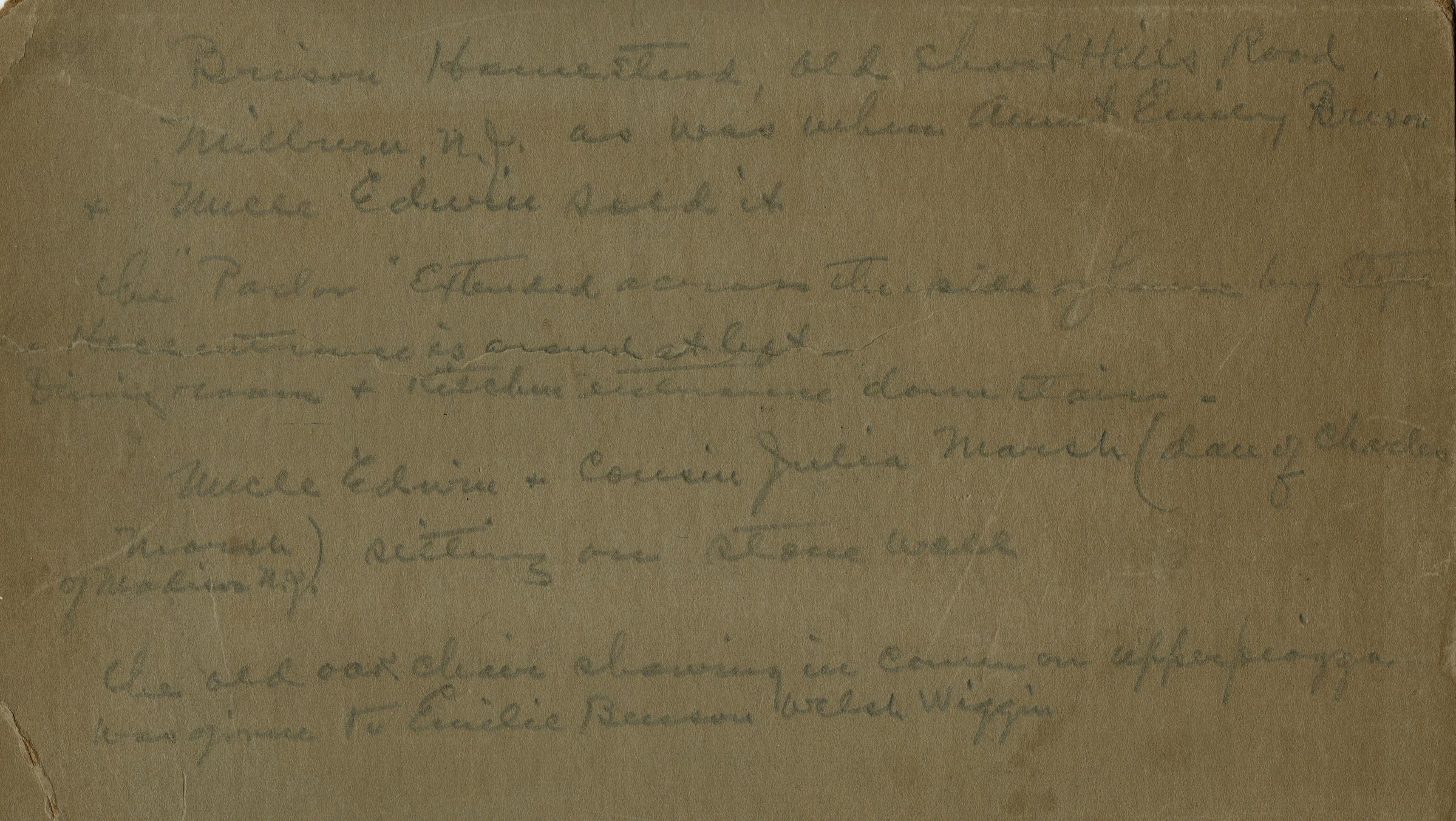One of several prints of this photographs of the Brison House on Old Short Hills Road and Brookside Drive showing Edwin Marsh Brison and Julia Marsh seated out front. Inscription on the verso of this print reads:
