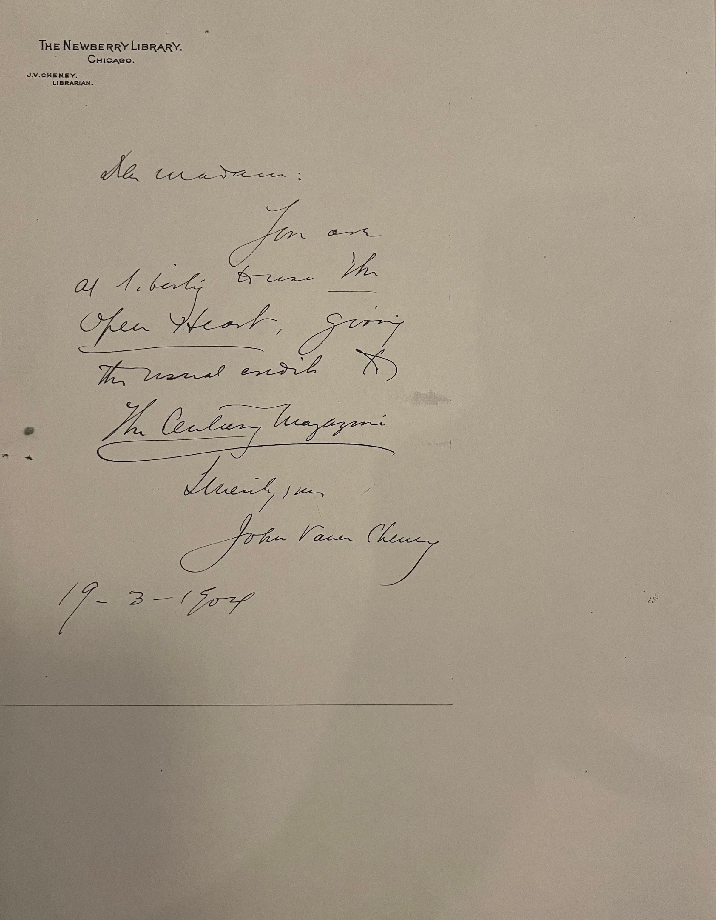 Letter from John Vance Cheney at the Newberry Library, Chicago dated March 19,1904, simply stating that she is free to use "The Open Heart" giving the usual credit to "The Century Magazine."Acquisition