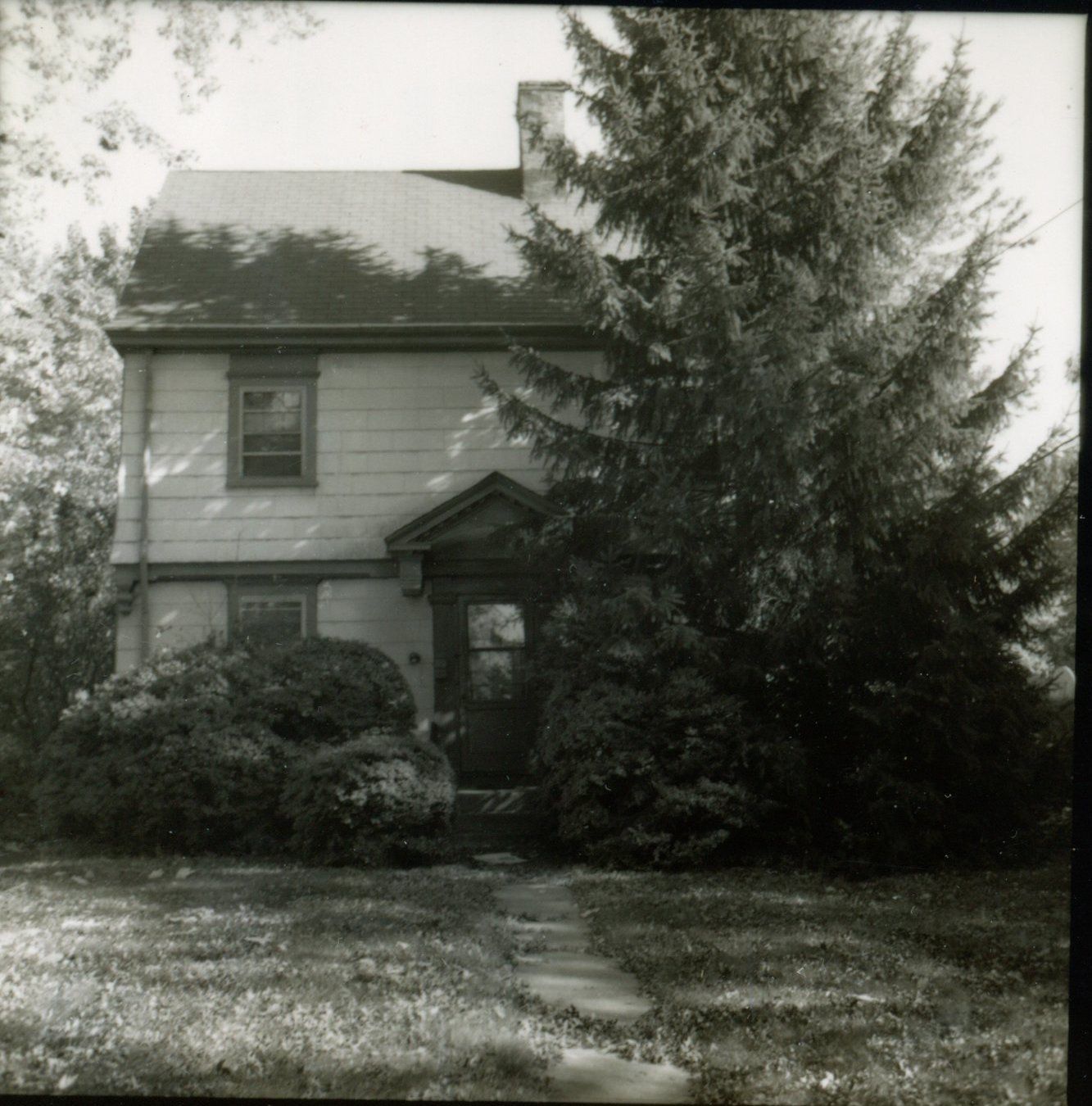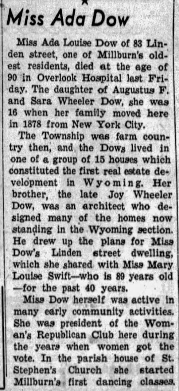 Photograph of 83 Linden Street in the Wyoming section of Millburn from the David Gibson 1978 Historic Sites Survey. The house was built presumably by architect Joy Wheeler Dow for his sister, Ada Louise Dow, who occupied the house along with her companion, Mary Louise Swift until her death in 1952. Ada Louise Dow is listed as the owner from 1907-1953. The house was then owned by John F. McQuillan Sr. and Jr. until 1993, when there was a proposal to demolish the house. The Millburn Township Historic Preservation Commission intervened and a buyer was found, who agreed to renovate and preserve the house.