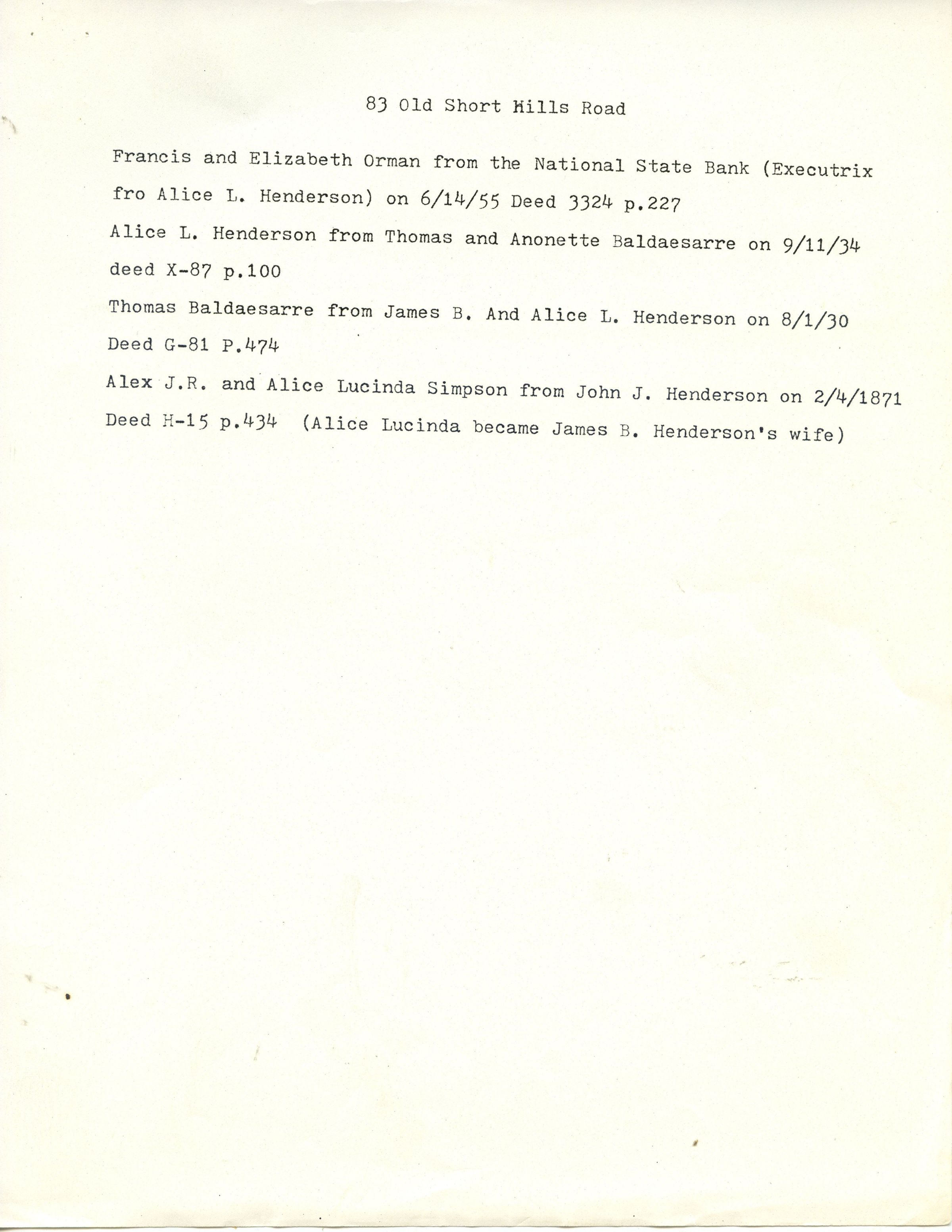 Photographs of 83 Old Short Hills Road from the David Gibson Historic Sites Survey. The house was constructed in c. 1859 and appears on the 1890 Robinson Map. Property was part of the John J. Henderson Tract.Collection