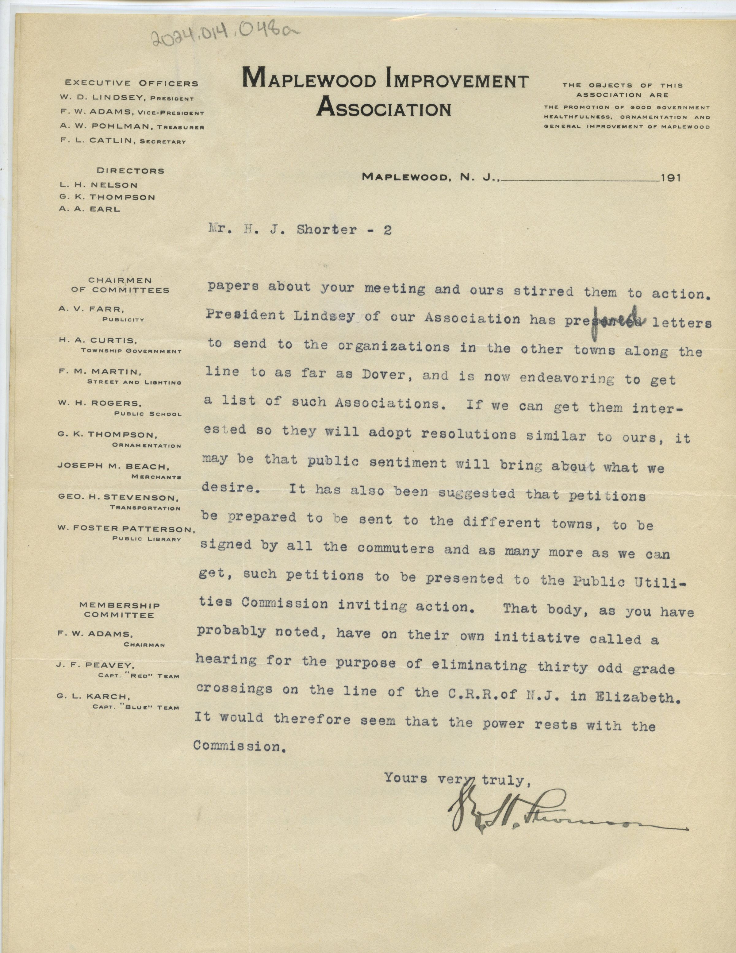 Letter exchange between March 15-18, 1915 between George H. Stevenson of the Maplewood Improvement Association and H.J Shorter from the Wyoming Civid Association. They both want to start a petition signed by commuters in associations along the railroad to eliminate odd grade crossings, but are having difficulties coming in contact with these associations.Collection