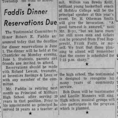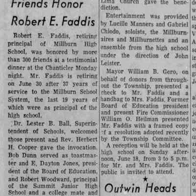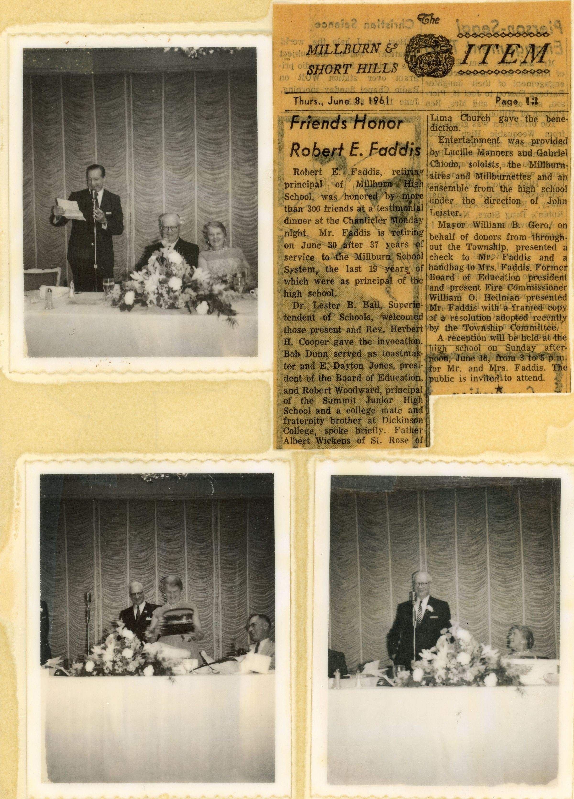 Photographs from the Testimonial Dinner for retiring Millburn High School Principal Robert E. Faddis held at the Chanticler, Monday, June 5, 1961. The photographs show Dr. Lester B. Ball, Superintendent of Schools, Robert and Sarah Faddis, Bob Dunn (toastmaster), Lucille Manners and Gabriel Chiodo (entertainers).Collection