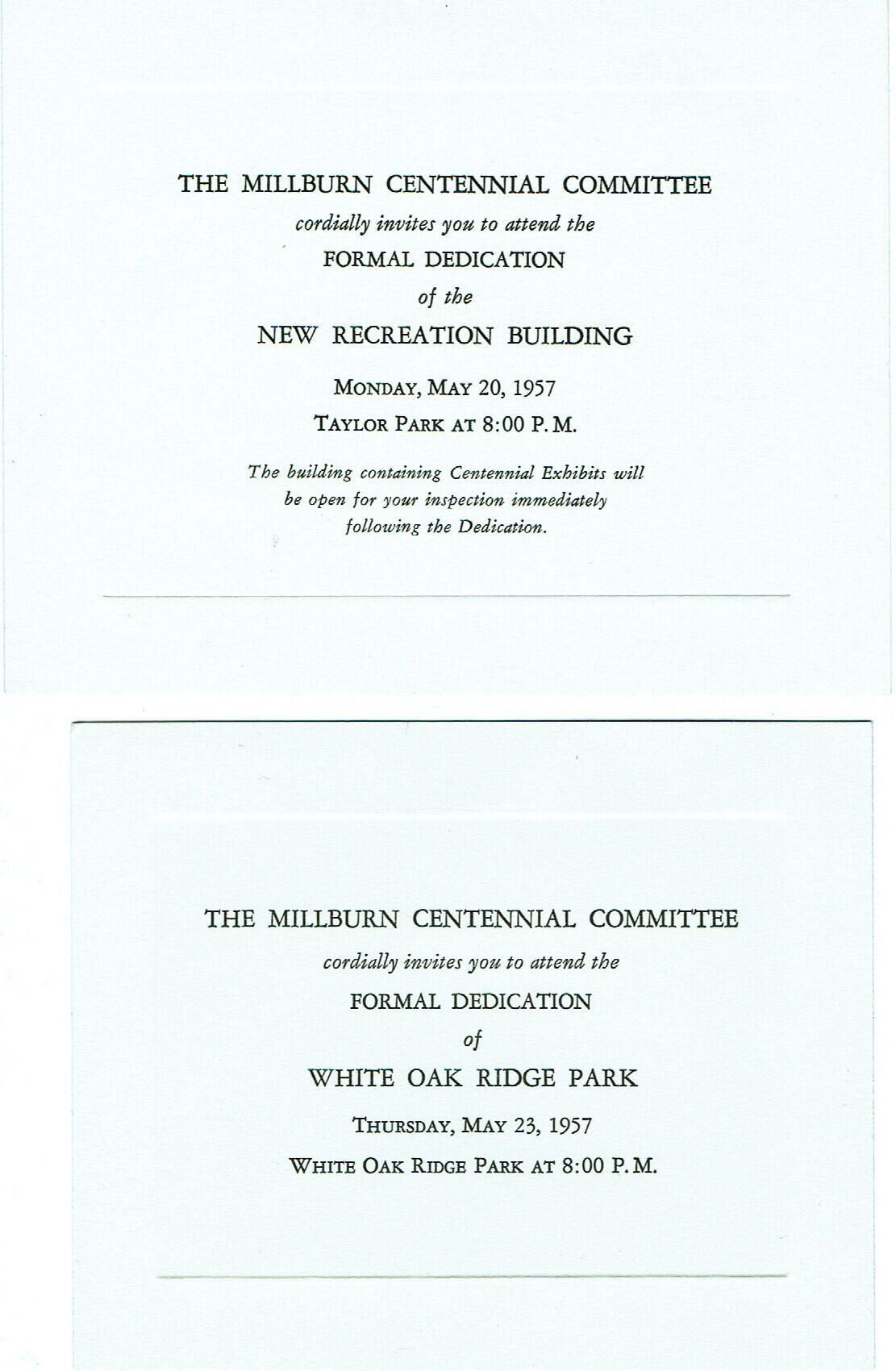 Invitations to the Dedication Ceremonies for White Oak Ridge Park and the New Recreation Building in Taylor Park in May 1957. The events were part of the festivities for the Millburn CentennialAcquisition