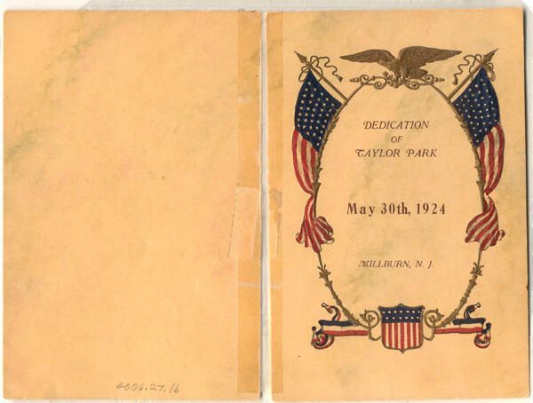 Single-sheet program for the May 30, 1924 dedication of Taylor Park to Millburn. The front and back covers separated and were reattached when donated to the historical society. Light overall soiling, specially on covers/outside.Acquisition