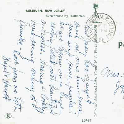 Postally used, color photographic postcard of Millburn avenue looking towards Lackawanna Place. Marks Brothers Radio Sales Store at 325-327 Millburn Avenue is in the center of the image.Collection