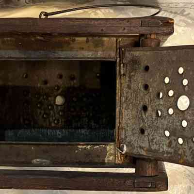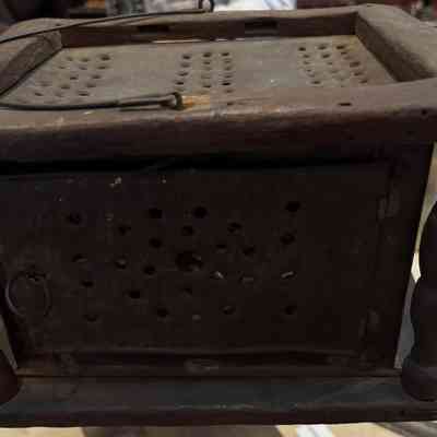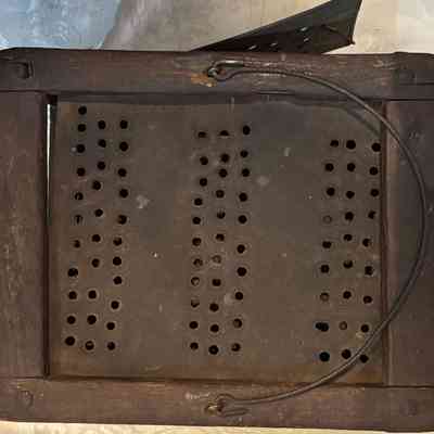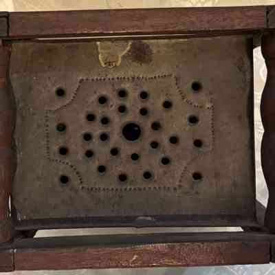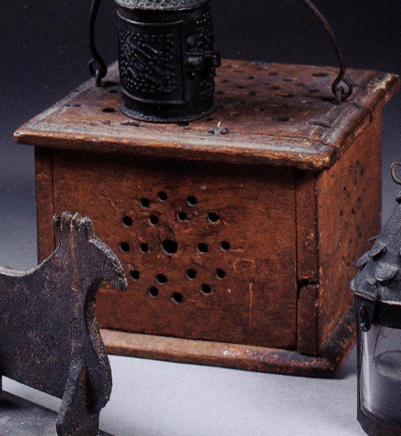 Foot warmers were commonly used in 18th and 19th century America. Normally, foot warmers contained tin trays to hold hot coals, which would be placed inside the tin box. Foot warmers provided supplemental heat to buildings, were easily transportable, so could accompany travelers on journeys. While effective, they were extreme fire hazards, especially when covered by women’s skirts or blankets as a means of insulating the heat.Collection