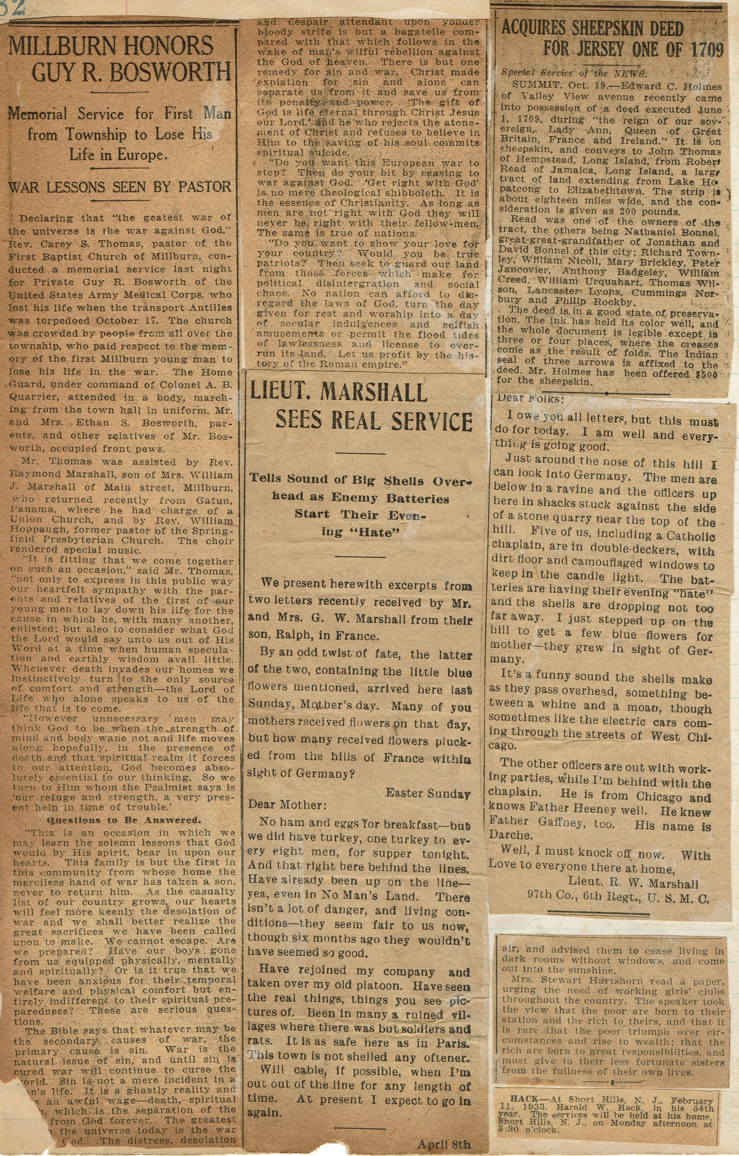 Page from Mrs. Herman Wehrle's scrapbook containing a newspaper clipping about the memorial service for Guy R. Bosworth, who died October 17, 1917, Letter from Ralph Marshall (Chicago Marshalls) to his mother from France during WWI, Obituary of Harald W. Hack (February 1933).Acquisition