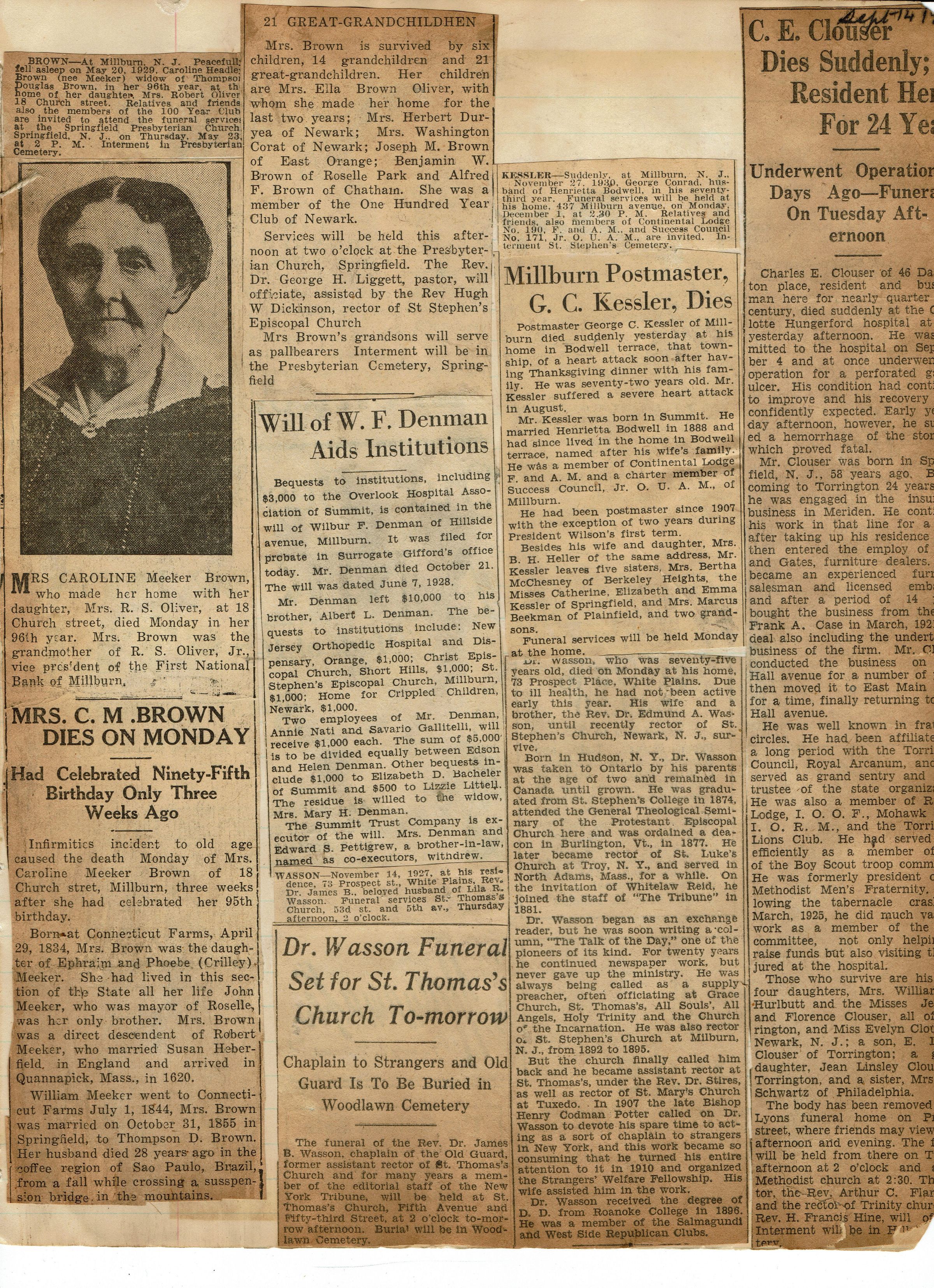 Page from Mrs. Herman Wehrle Scrapbook with obituaries of family and friends from Millburn including: Caroline Meeker Brown (May 1929)--mother of Mrs. R.S. Oliver, Wilbur F. Denman, George Conrad Kessler (November 1930).Acquisition
