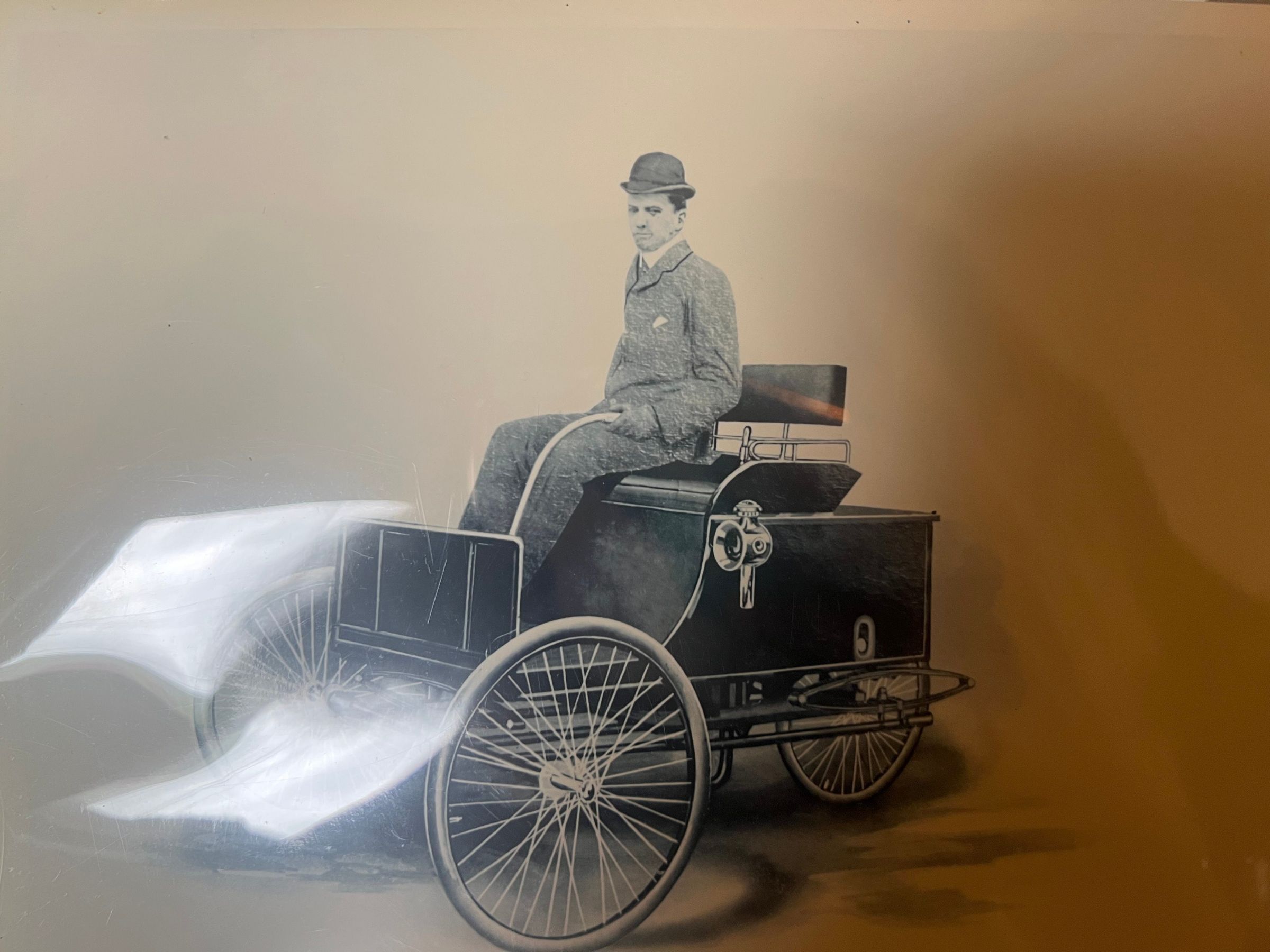 Black and white photo of Kelsey sitting in his Auto Tri, a three-wheeled automobile built by himself and his friend Sheldon Tilney in 1899. The back has three pieces of writing which say, "From Smithsonian archives," "MAH-34183-A," and "Cadwallader Washburn Kelsey's auto Tri"Acquisition