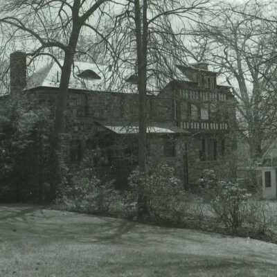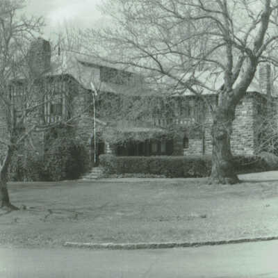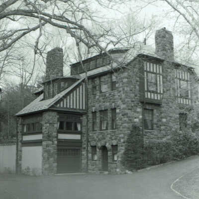 Photograph of 71 Taylor Road. "Stoneacre" - Hartshorn House Number 65. Edward Layng, a local architect and builder for Stewart Hartshorn, built this 20th cent. Eclectic style house in 1908. It has a gable and hip roof with slate covering; exterior finish in stone wood timber and stucco. Note the ornamental chimneys, arched entry-way and bay windows over entrance.Collection