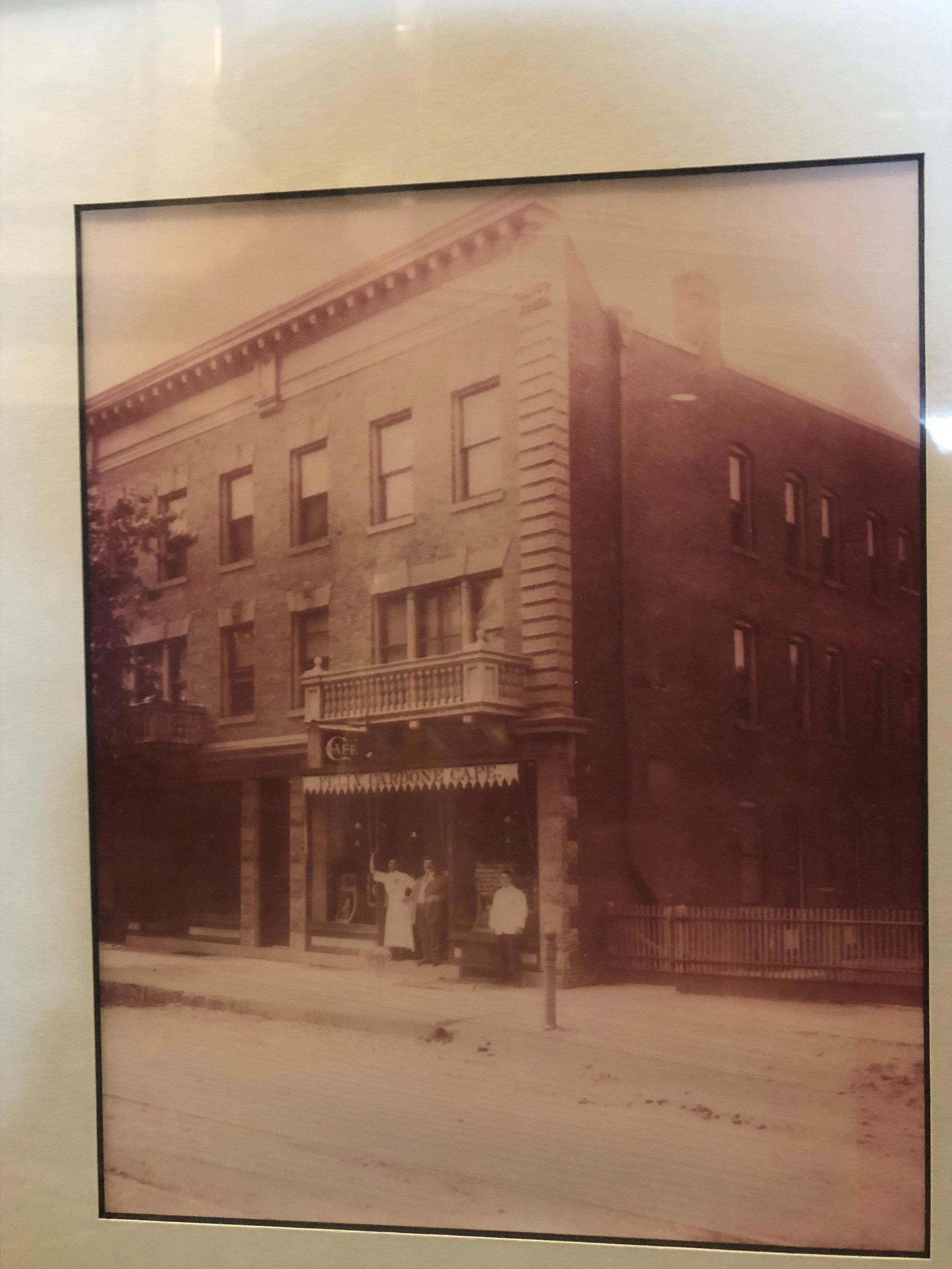 Photograph of the Felix Cardone Cafe from 1911. The establishment later became Mario's Restaurant and Charlie Brown's Cafe. Pictured are: Frank Masi (Standing alone), Felix Cardone (Wearing a Suit) and Tom Cardone (Wearing an Apron). According to an inscription on the back of the photograph, Tom brought Italian immigrants to the United States to work on the railroad. he gave them Room & Board.