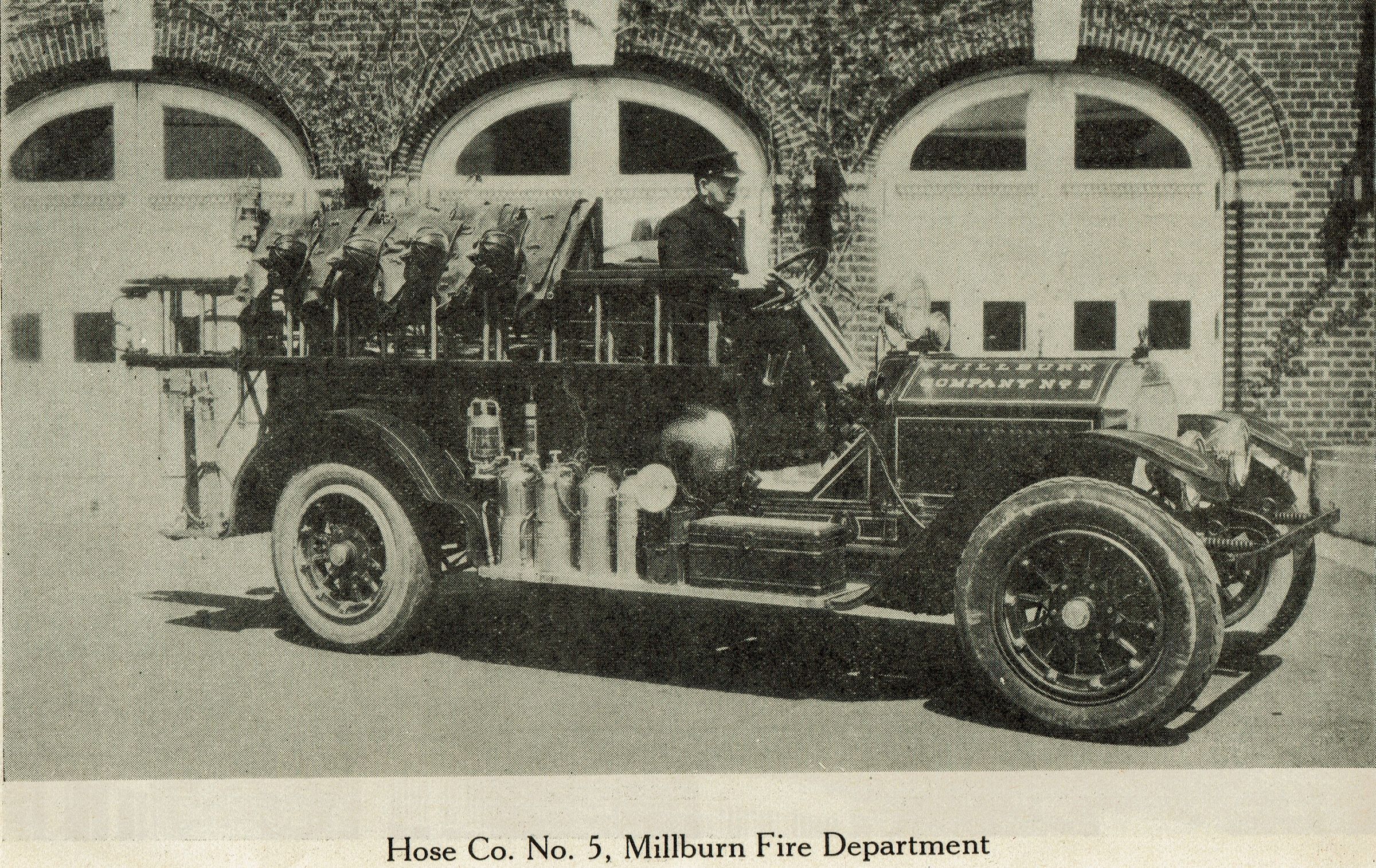 1927 Millburn Fire Department benefit performance program at the Millburn Theatre (Theater). Ca. 50-page softcover program with a red cover. The contents of the program include many ads for local and nearby businesses, a history of the MIllburn Fire Department, a list of the fire chiefs, photos of some of the chiefs, photos of fire trucks/apparatus/equipment, fire department headquarters buildings, photos of members of the fire department, photos of interior rooms in the department, etc.