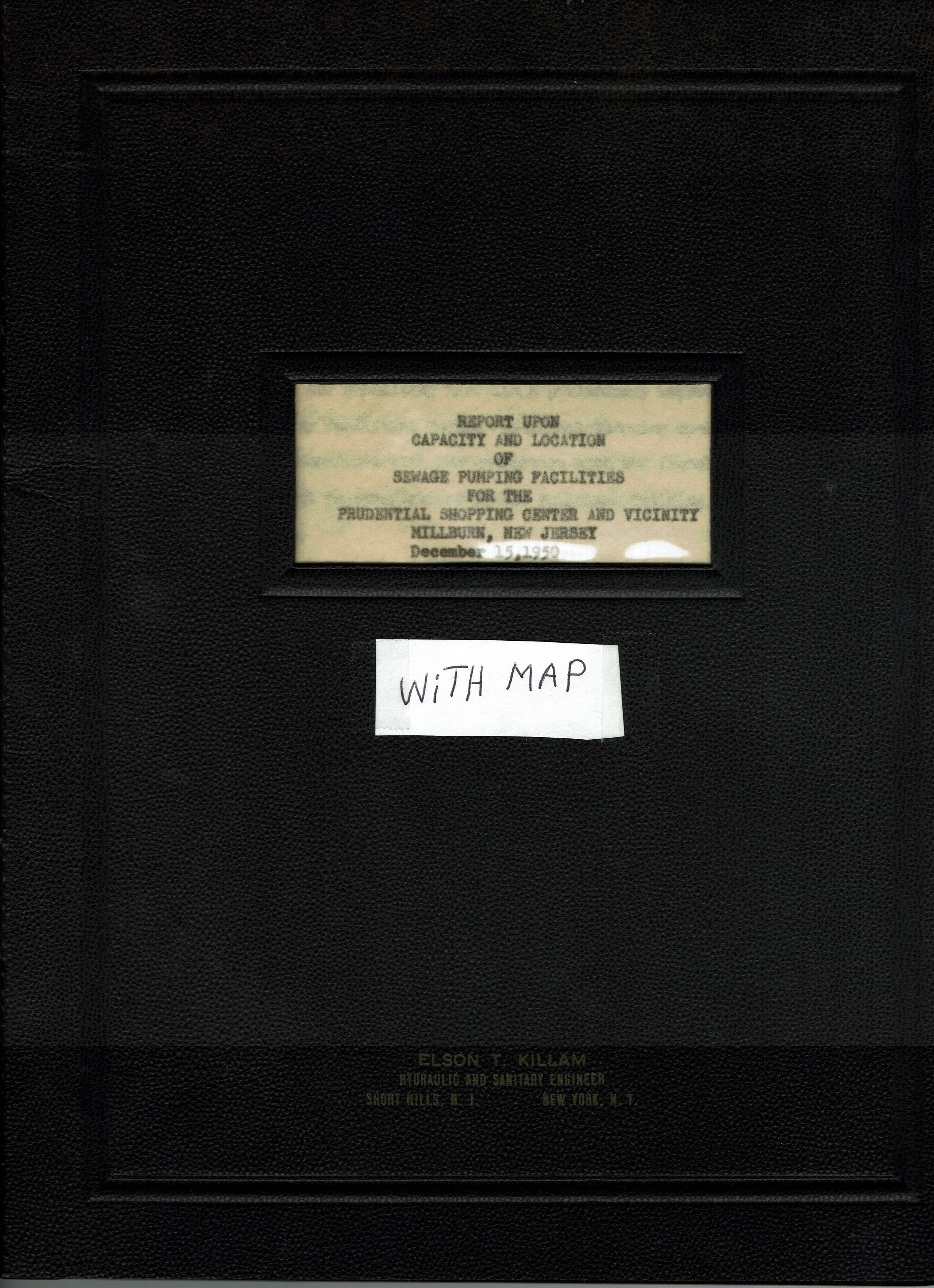 Report upon capacity and location of sewage pumping facilities for the Prudential Shopping Center and vicinity, Millburn, NJ December 13, 1950 prepared by Elson T. Killam, Hydraulic and Sanitary Engineer, Short Hills. Report was prepared upon the request of the Millburn Township Committee in advance of the proposed Prudential Office Building and Shopping Center being proposed near JFK Parkway. 7 page typed report, plus 3 pages of charts and tables and 2 maps.Acquisition