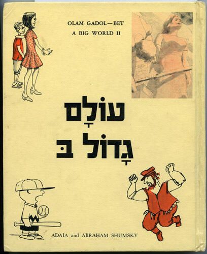 72-page hard-cover children's book written in Hebrew with illustrations and some translation to english. Front cover is cream colored with "OLAN GADOL--BET A BIG WORLD II" in small black letters on top with larger phrase in Hebrew in center of page. Along bottom in black says, "ADAIA and ABRAHAM SHRUMSKY". Sketches on front of book are black and orange in color. There is a sketch of a woman holding a stick-like object and staring toward binding direction in upper right portion with sketch of boy and girl in upper left portion. In lower left is sketch of Charlie Brown character with bat and in lower right is sketch of man dancing who appears like the father character from 'Fiddler on the Roof'. Back of book cream colored with orange sketch of world circled by smiling people arm in arm. Book's copyright is 1973 by the Union of American Hebrew Congregations, New York. Second printing 1975. Book with soiling and dents in hard cover in corners and on binding. Pencil mark on front fly page half way up ca. 2".. Obtained by Lynne Ranieri online.Acquisition