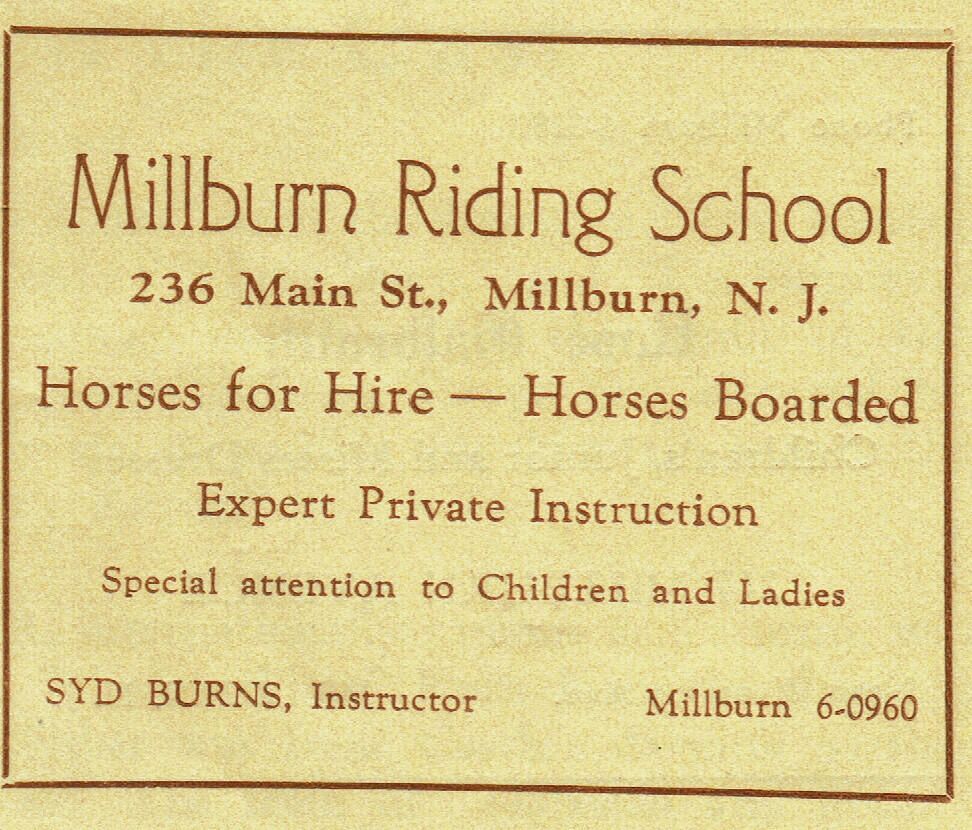 Advertisement for Millburn Riding School, 236 Main Street, Millburn, NJ from Paper Mill Playhouse New Jersey Theatre Festival Program, 1939. Horse for Hire-Horses Boarded. Expert Private Instruction: Special attention to Children and Ladies. Syd Burns, Instructor.Acquisition