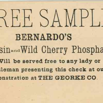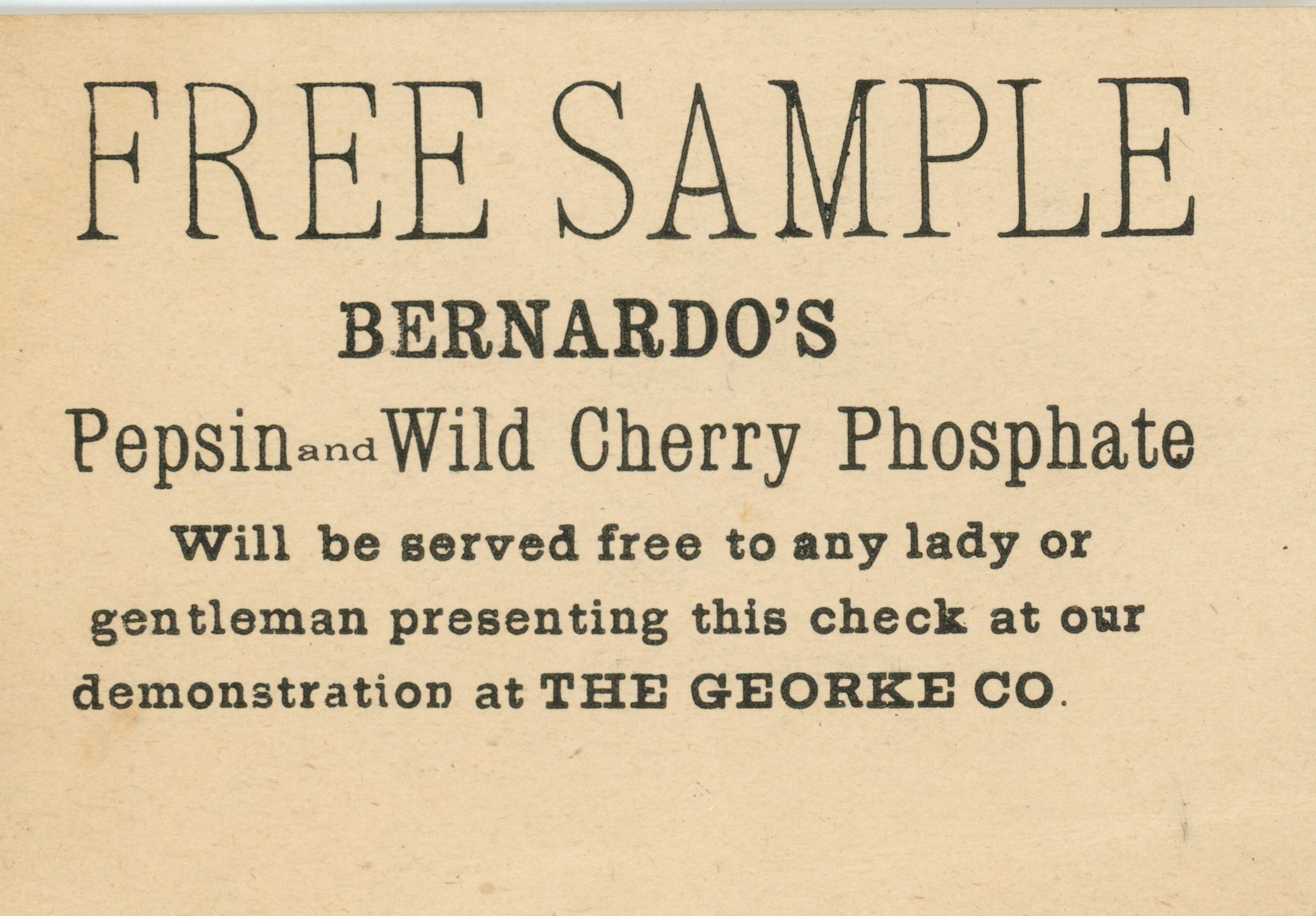 Free Sample Bernardo's Pepsin and Whild Cherry Phosphate Will be served free to any lady or gentleman presenting this check at our demonstration at the Georke Co.Acquisition