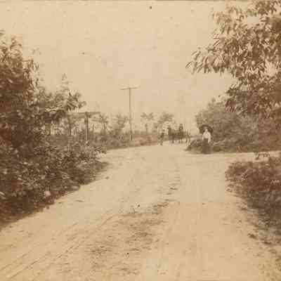Photographs of unidentified well-dressed people standing on dirt roads or pathways. Possibly generic scenes.Collection
