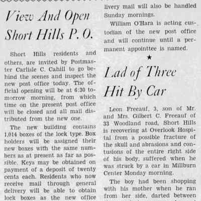First Day Cover commemorating the opening of the new post office building in Short Hills, New Jersey on July 30, 1938, Postally used and addressed to Miss Anna Hoch, c/o Auerbacher 206 4th Ave., Belmar, NJ. Signed by postmaster Carlisle C. Cahill and postmarked Short Hills, N.J. July 30, 1938, 6 pm.Acquisition