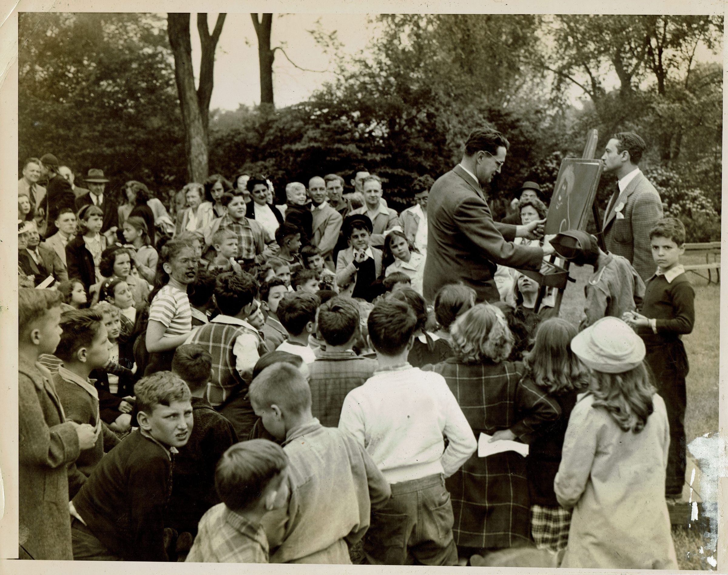 Photographs of illustrator Roger Duvoisin sketching at the second annual Village Arts Festival, June 2, 1945.Collection