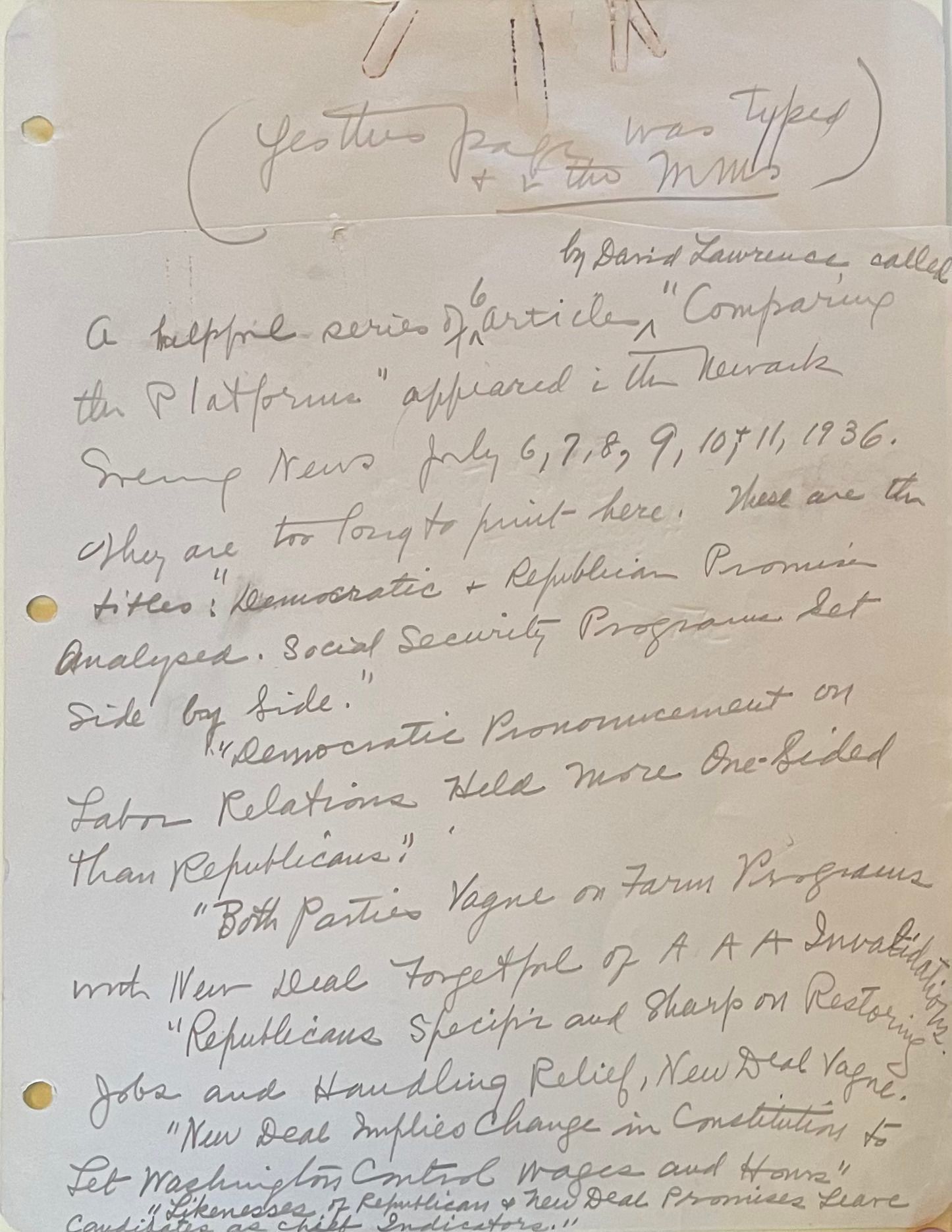 Written notes by Stella about the 6-article series "Comparing the Platforms" by David Lawrence in the Newark Evening News (July 1936). Her notes consisted of her giving the titles and dates of the articles. The main topic of Lawrence's articles was the New Deal and a general comparison of the platforms the two major political parties were basing their clams for suffrage.