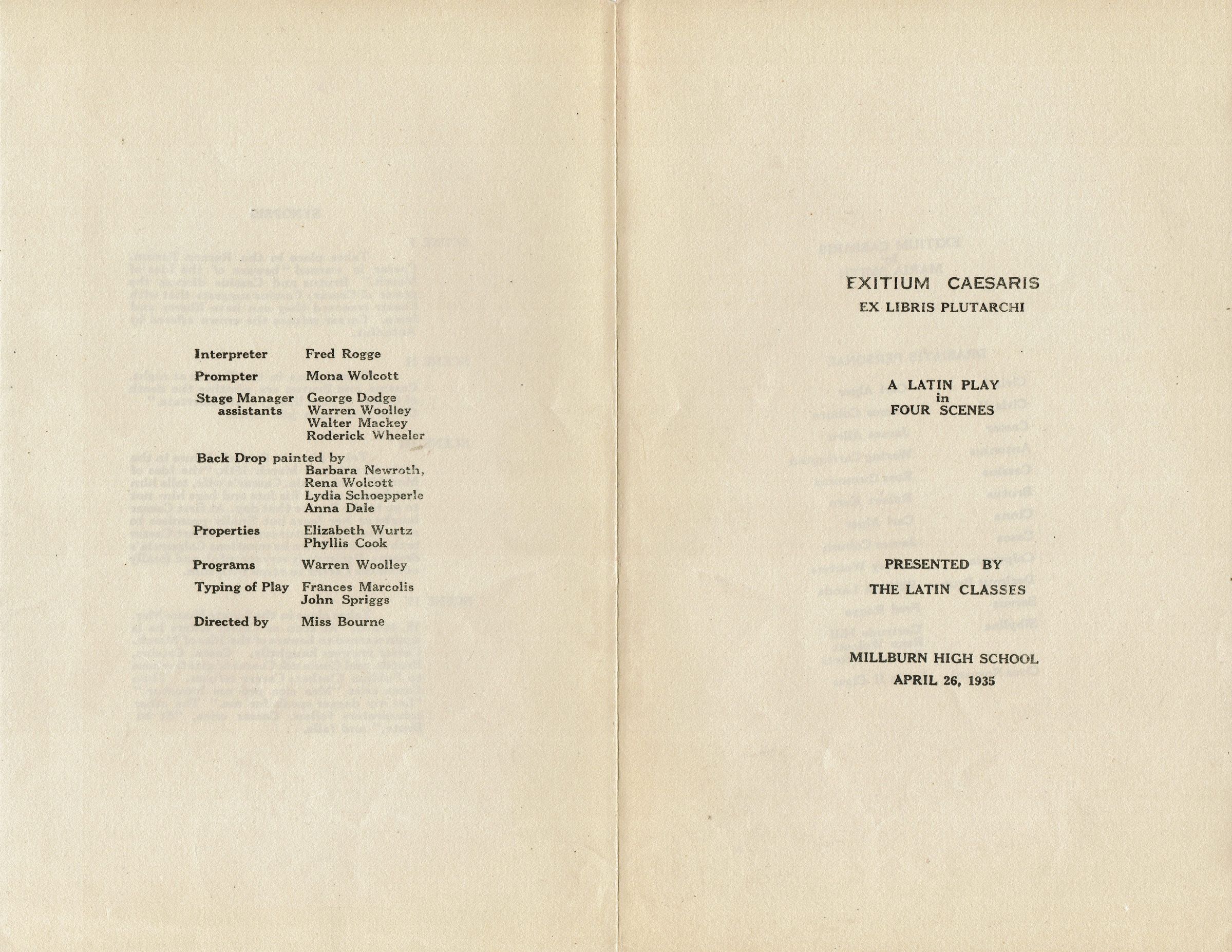 Program for "Exitium Caesaris": A Latin Play in Four Scenes presented by the Millburn High School Latin Classes, April 26, 1935. Participants were: Carl Alper, James Coburn, James Allen, Waring Carrington, Ross Cummins, Robert Kern, Audrey Wouters, William Landa, Fred Rogge, Gertrude Hill, Rena Wolcott and Jeanne Roberts. 4 pp.Acquisition