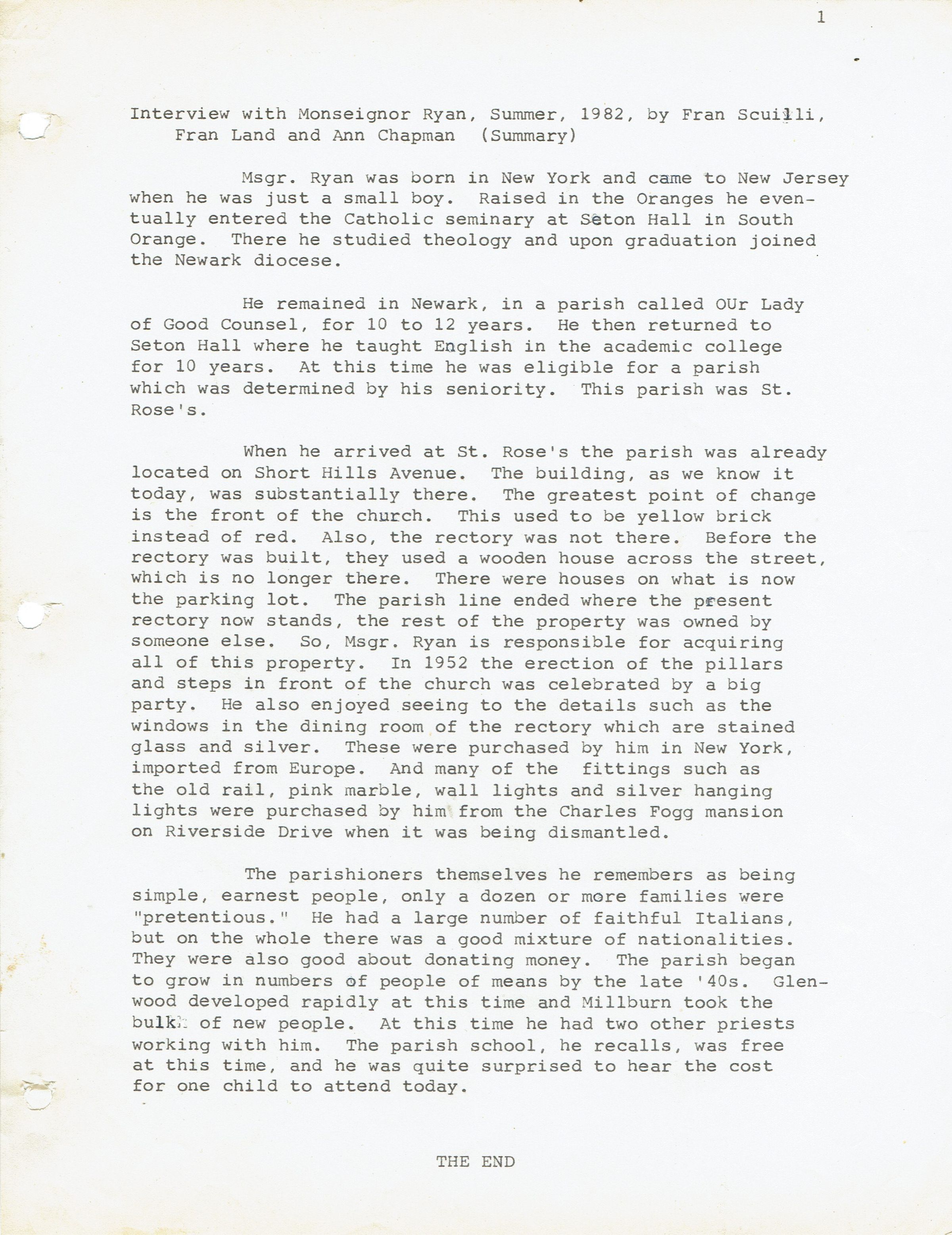Oral History Interview with Monsignor Ryan of St. Rose of Lima Catholic Church conducted by Fran Scuilli, Fran Land and Ann Chapman. 1 page summary.