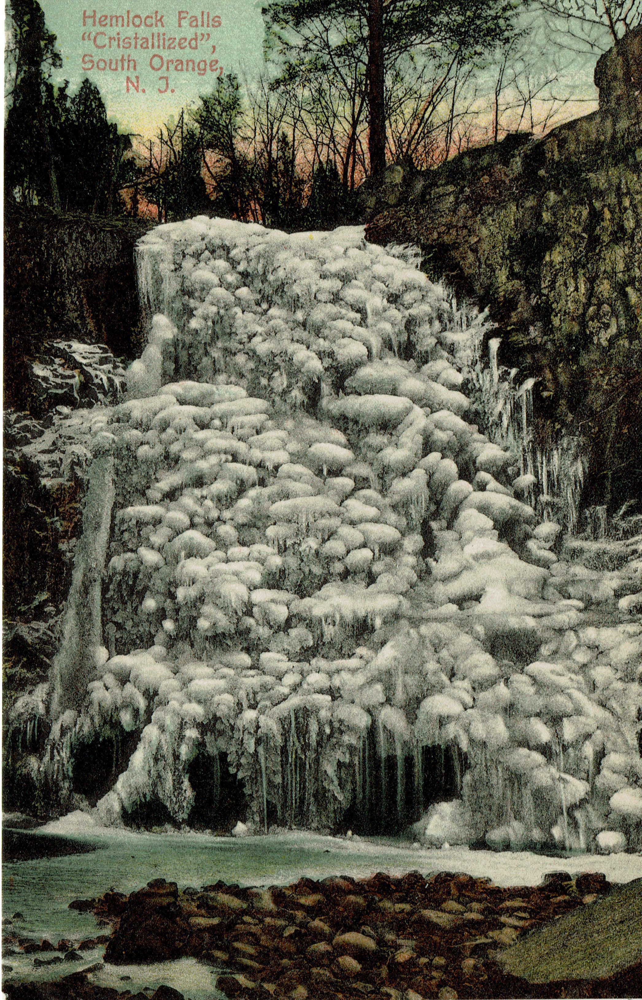 Color postcard of Hemlock Falls in the South Orange Reservation, South Orange, NJ during a winter freeze in which the falls have crystallized. Postally unused.Collection