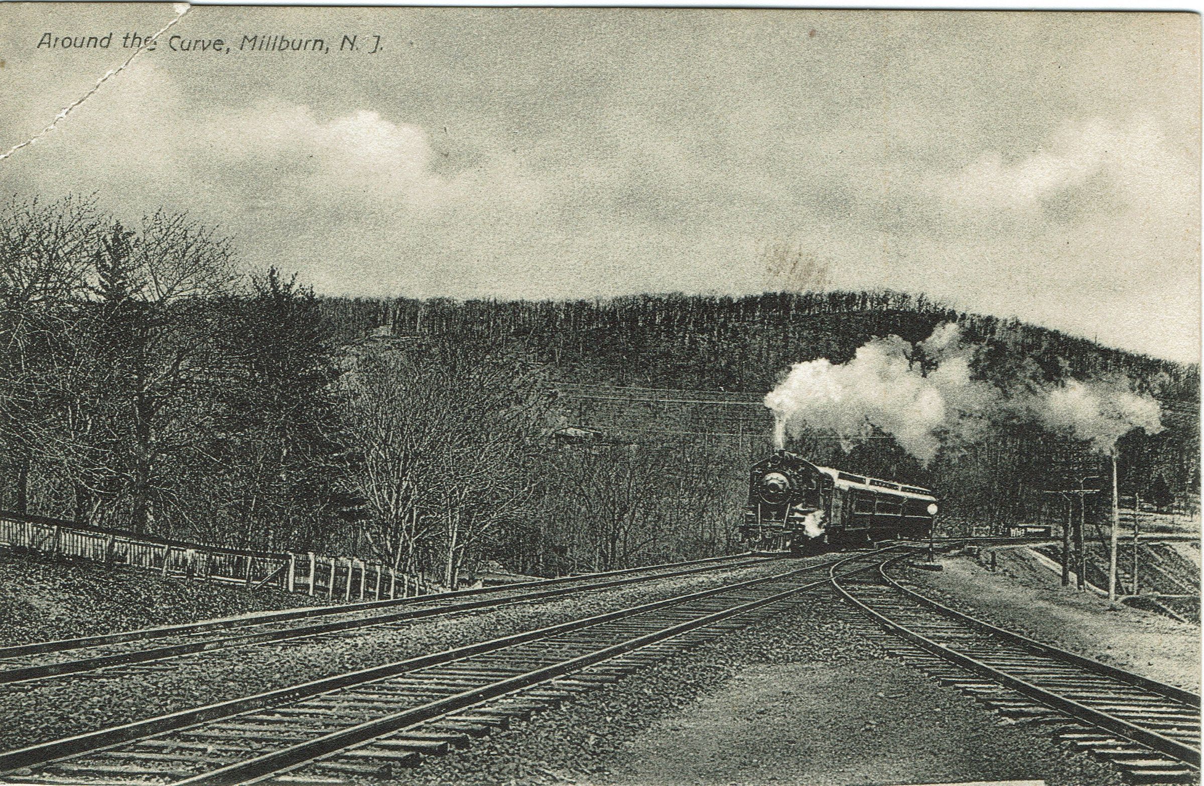 Postally unused, B&W postcard showing a westbound train rounding the curve in Millburn with South Mountain in the background. The next stop is Short Hills.Collection