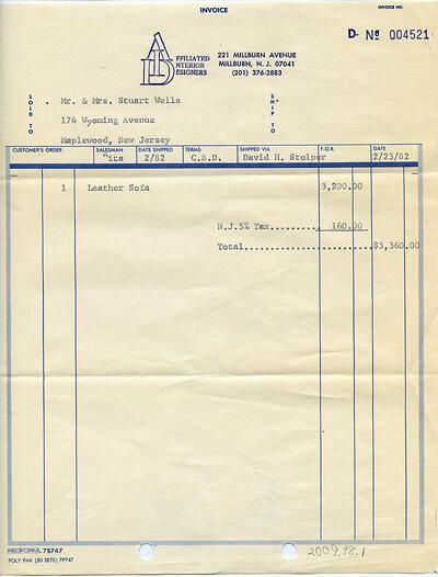 White 1982 Invoice from Affiliated Interior Designers of 221 Millburn Ave., Millburn, NJ. Invoice #004521, sold to M/M Stuart Wells, 176 Wyoming Ave., Maplewood, NJ, for a leather sofa. 2 horizontal fold marks & light yellowing around edges.Acquisition