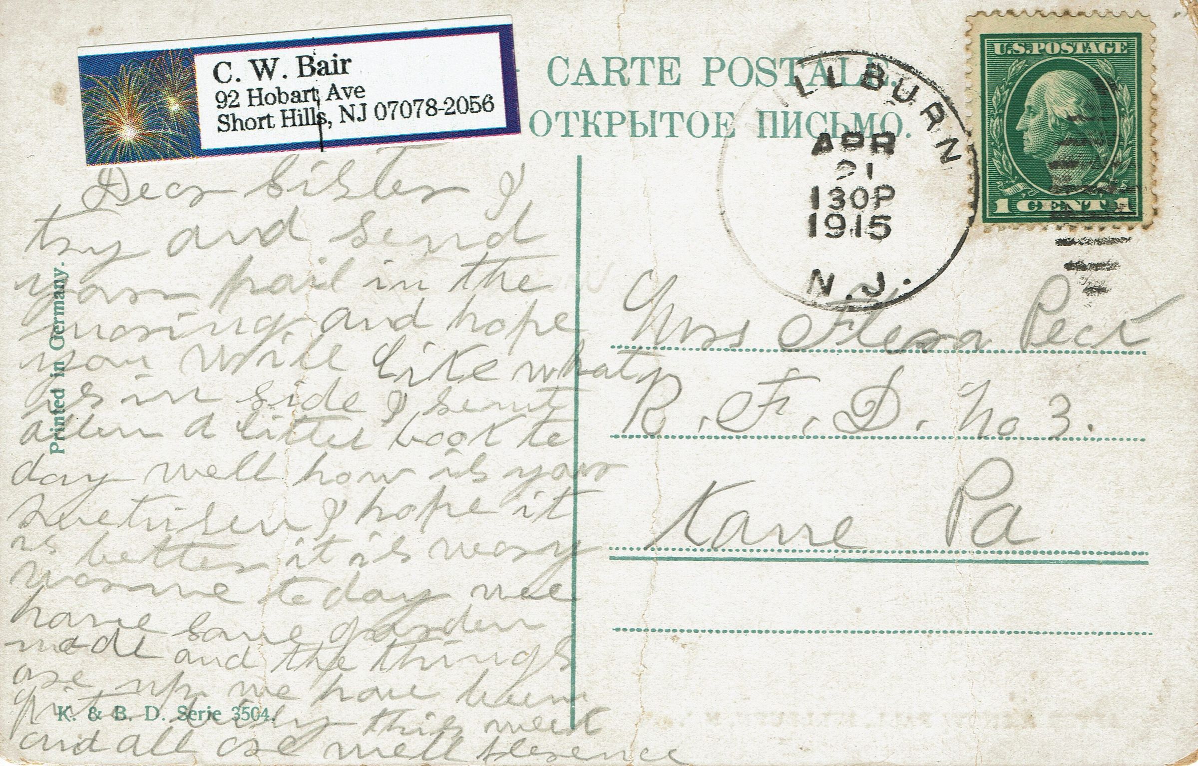 Postally used. Postmarked Millburn, April 21, 1915, 1:30 pm. Card is addressed to Miss Flesa Peck, R.G.D. No. 3, Kane PA..Collection
