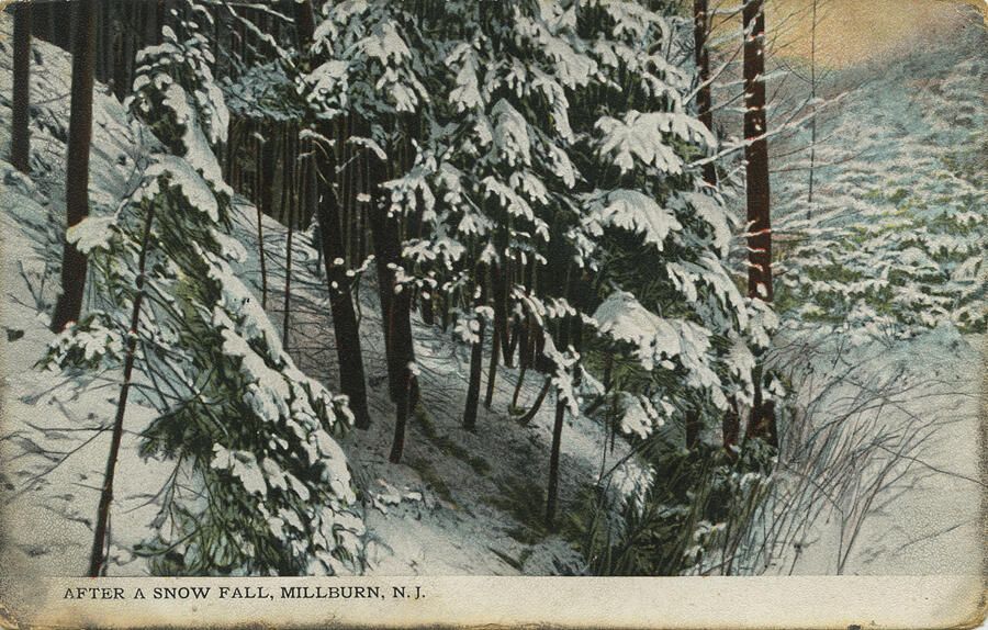 Real-photo color postcard titles "After a Snow Fall, Millburn, N.J." The postcard was addressed to Mrs. Acontius; 1939 Grand Ave; Chicago IL and was sent by Isabel. The sender wrote "It is just fine here. I like it very much. Send my love to all write to me Millburn N.J." The card was printed by K & B D" and is identified as series 3540. Corners are bumped and edges are worn. There is a ca. 1/2" stain on the front lower left corner of the card. The front and back of the card are lightly yellowed and primarily visible around the edges of the back of the card. The postcard was purchased from CardCow.com; 1060 Karen Way; Mountain View CA 94040.Collection
