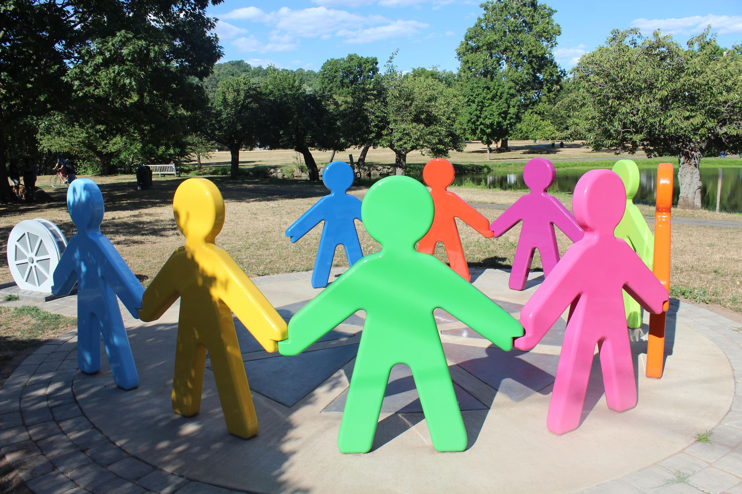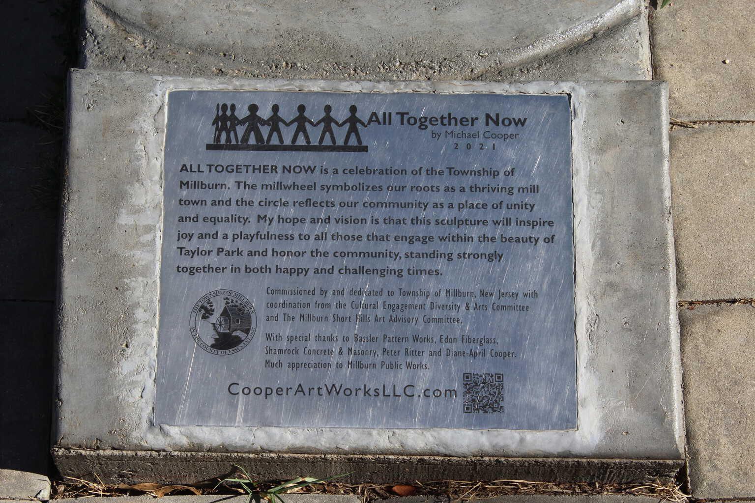 "All Together Now" sculpture, created by Michael Cooper in 2021. The work symbolizes equality and celebrates all corners of the Millburn community and is in Taylor Park, Millburn. The work was commissioned by the Township of Millburn in coordination with the Cultural Engagement Diversity & Arts Committee (CEDA) and The Millburn Short Hills Art Advisory Committee. Photograph by Julian Chua, August 2022.Acquisition