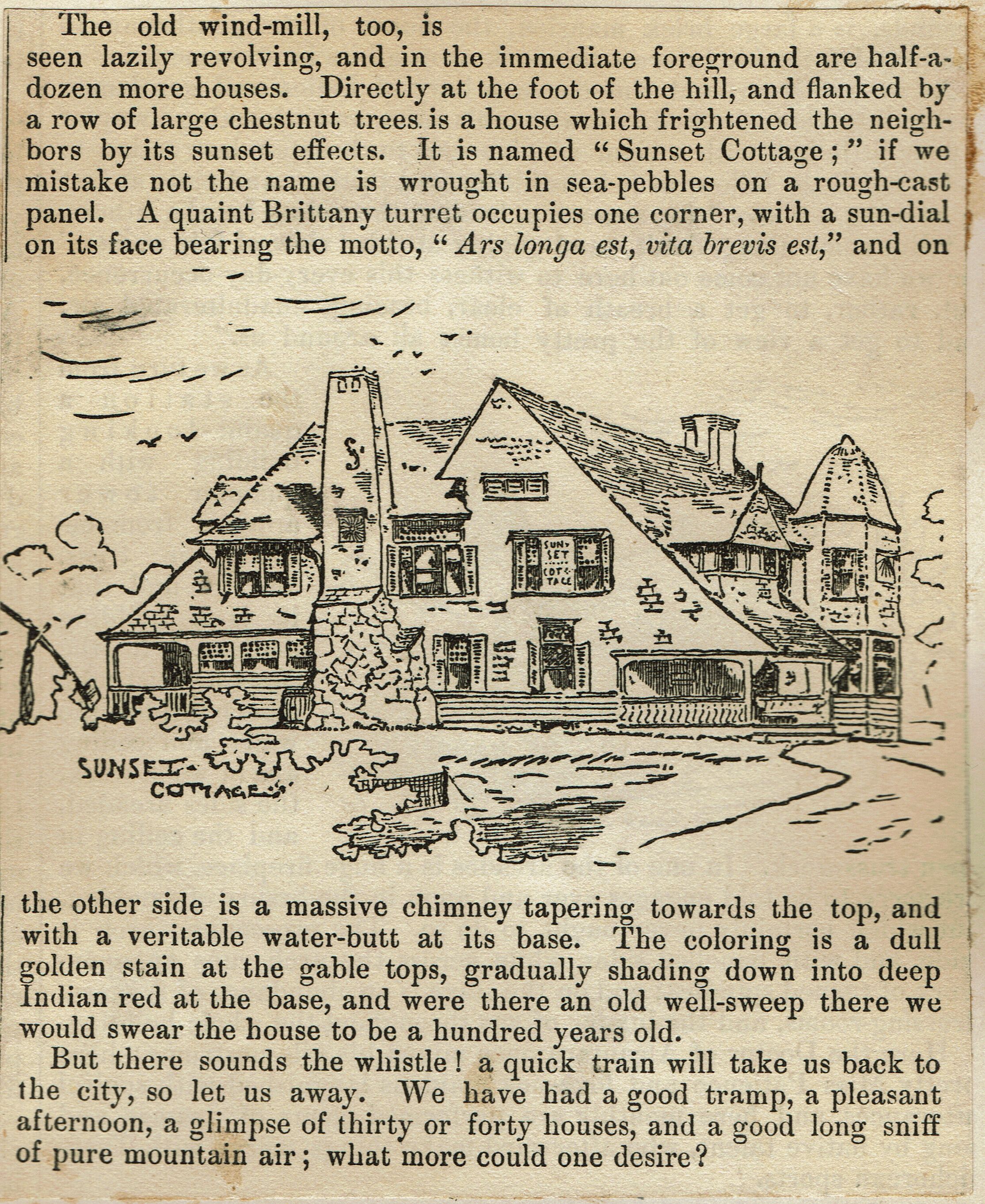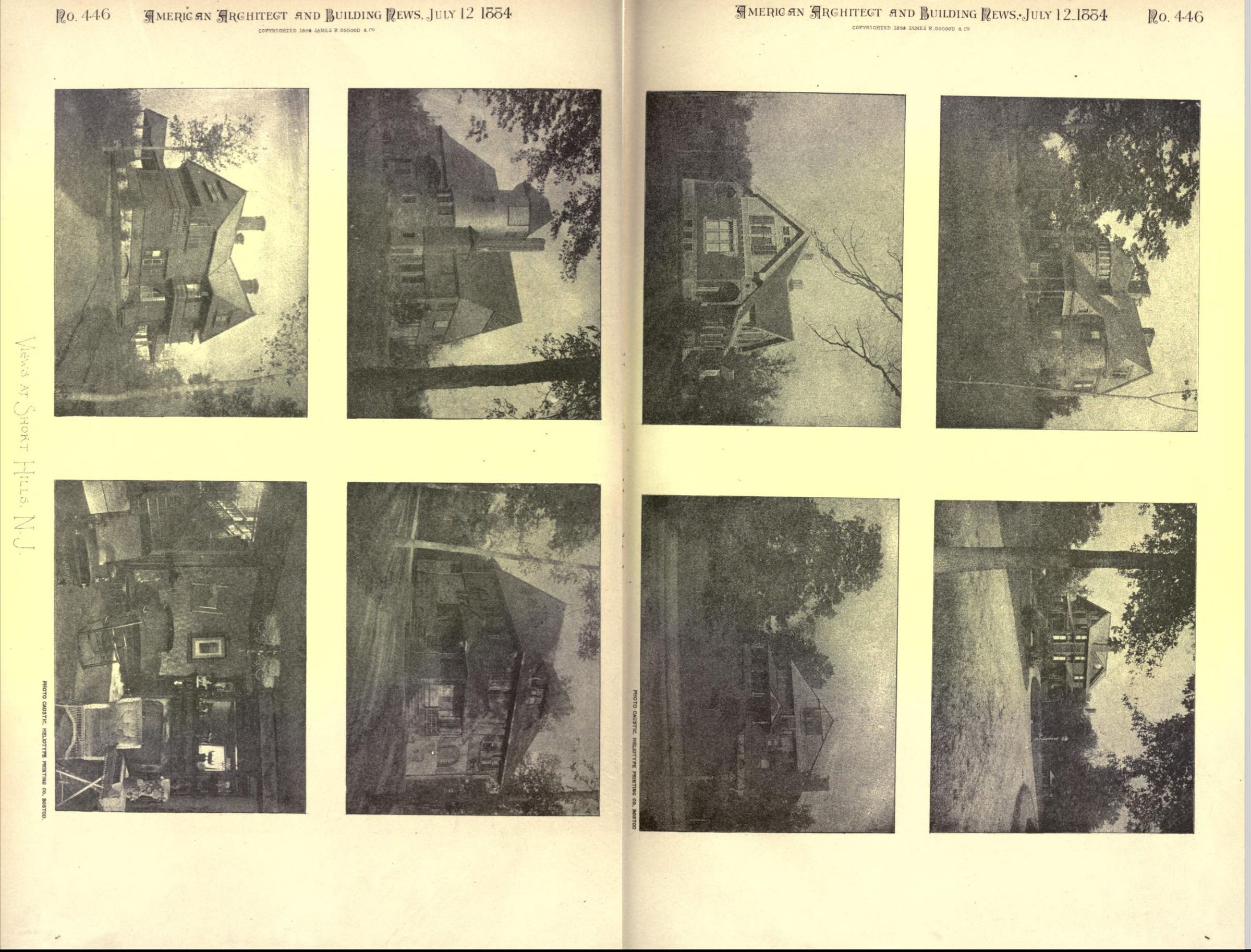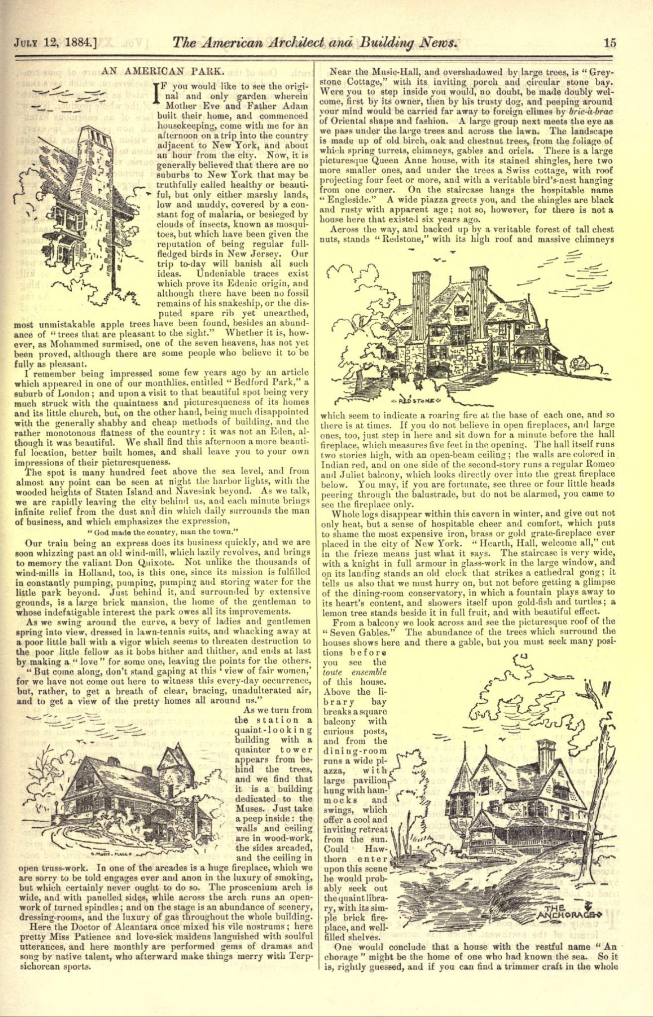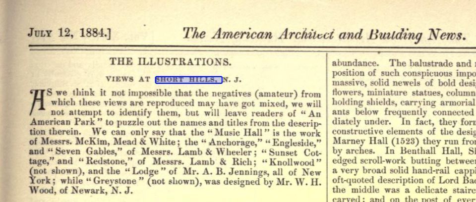 "An American Park," American Architect & Building News article, July 12, 1884 describing the architecture and landscape of Short Hills. The article describes traveling by train from New York City to Short Hills, New Jersey and contains illustrations of Stanford White's Music Hall (Casino/Racquet's Club), the Redstone, the Anchorage and Sunset Cottage. There are also 2 pages of B&W photographs entitled "Views of Short Hills." Other buildings described in the text include: The Short Hills Train Station, Greystone Cottage, and Knollwood.