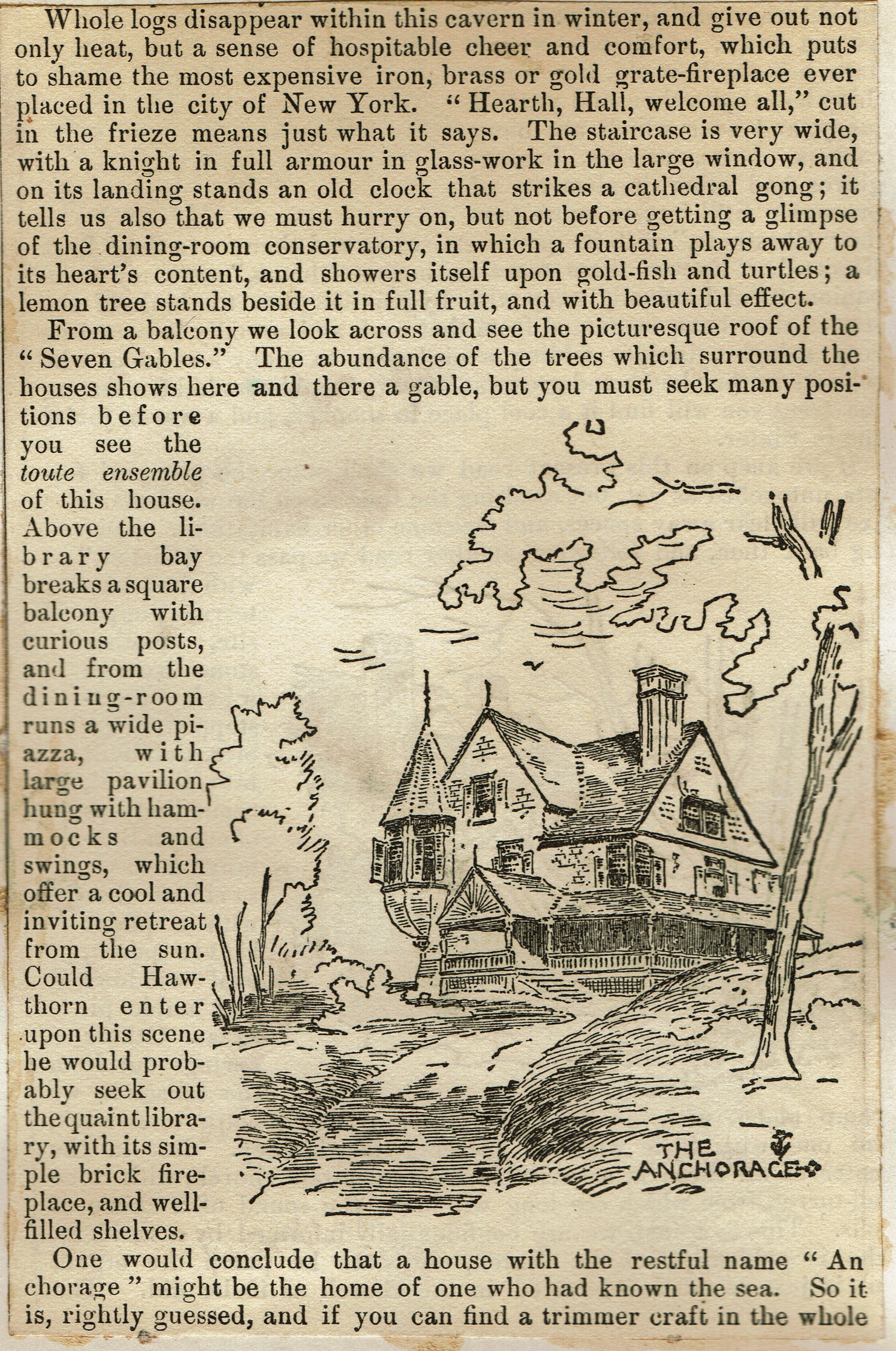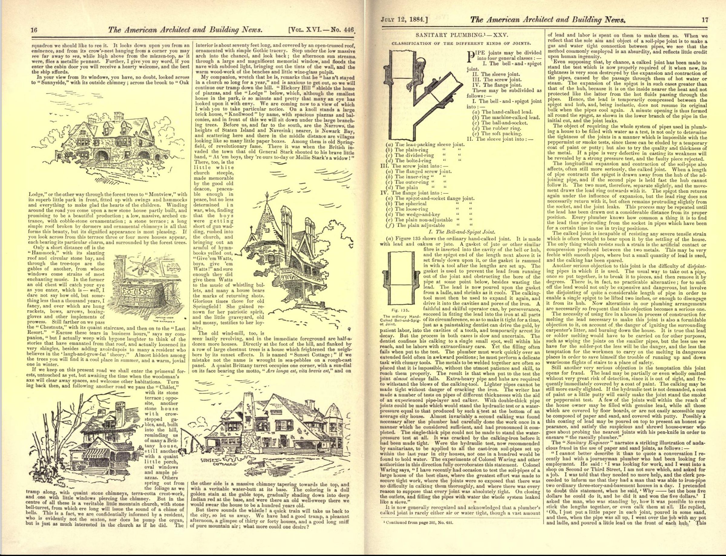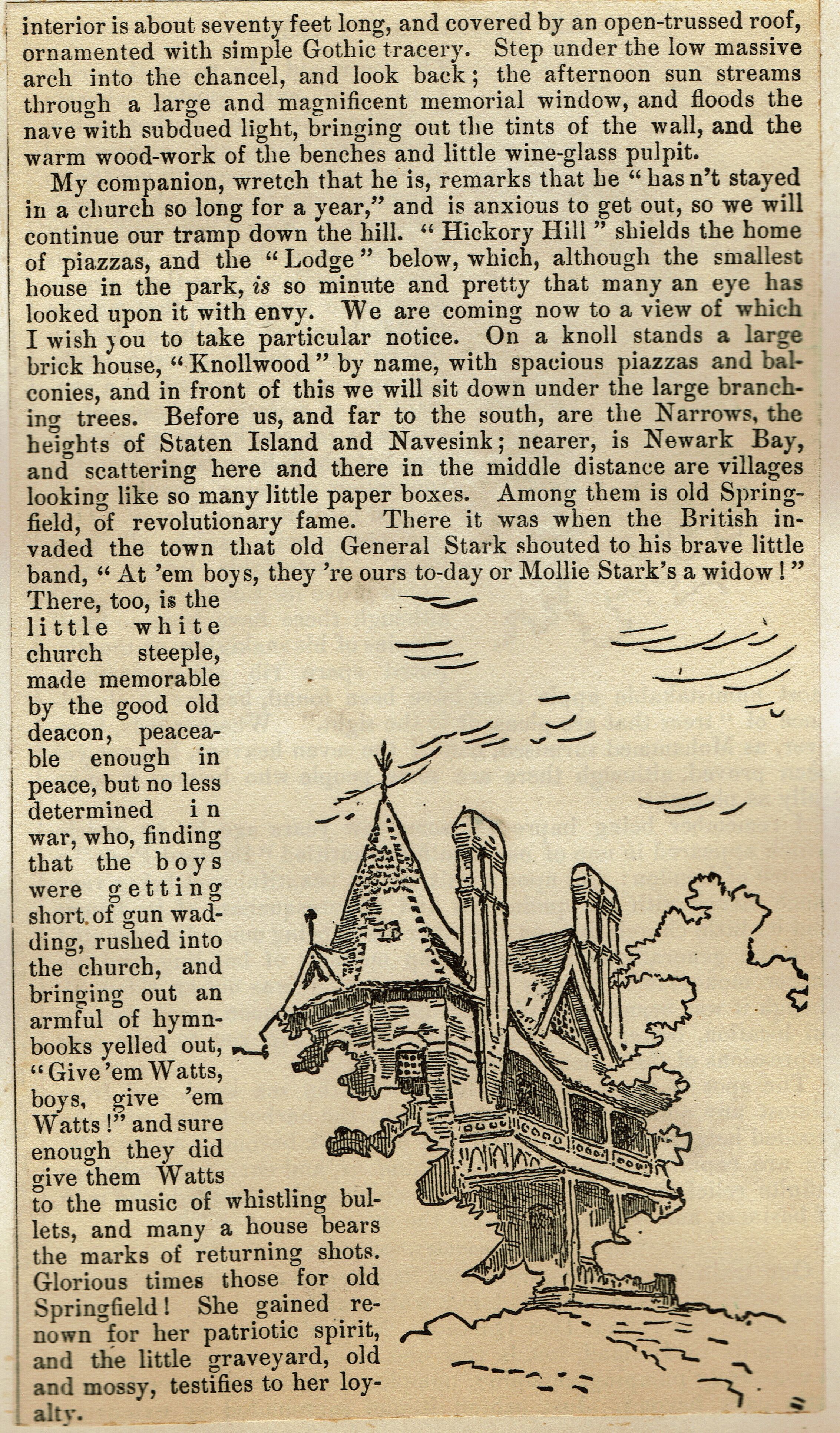 "An American Park," American Architect & Building News article, July 12, 1884 describing the architecture and landscape of Short Hills. The article describes traveling by train from New York City to Short Hills, New Jersey and contains illustrations of Stanford White's Music Hall (Casino/Racquet's Club), the Redstone, the Anchorage and Sunset Cottage. There are also 2 pages of B&W photographs entitled "Views of Short Hills." Other buildings described in the text include: The Short Hills Train Station, Greystone Cottage, and Knollwood.
