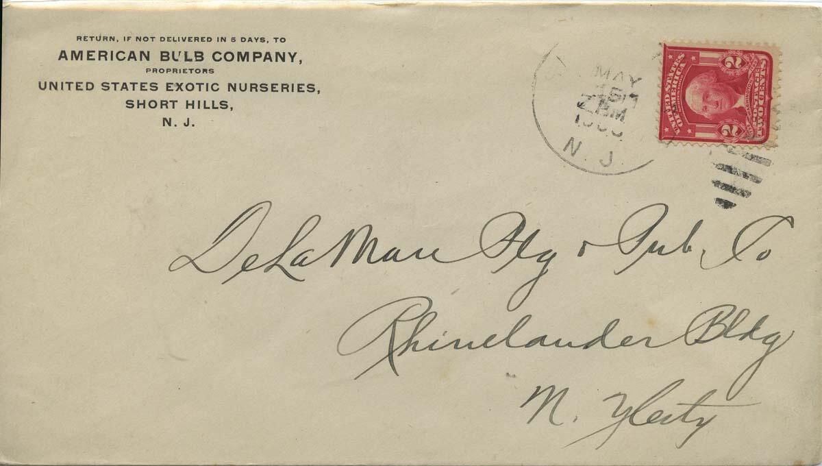 Slightly yellowed empty envelope, New Jersey cancellation May 1906(?), 4 pm; from the American Bulb Co., proprietors of United States Exotic Nurseries. Sent to De La Mare Prinnting & Publishing Co., Rhinelander building, New York City. Cancellation ink marks on front left quadrant. Thumbprint-sized ink smudge on the back left middle of the envelope. Edgewear and bumped corners. Red 2 - cent stamp, Geo. Washington in profile. Purchased on eBay from William Fisher; 222 S. Fairview St., Apt. 4; Riverside, NJ 08075.Acquisition